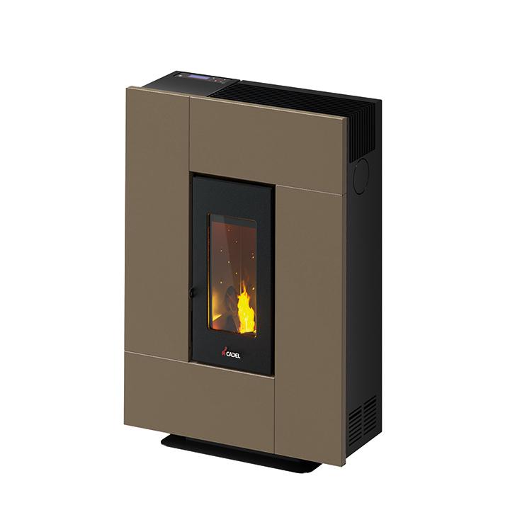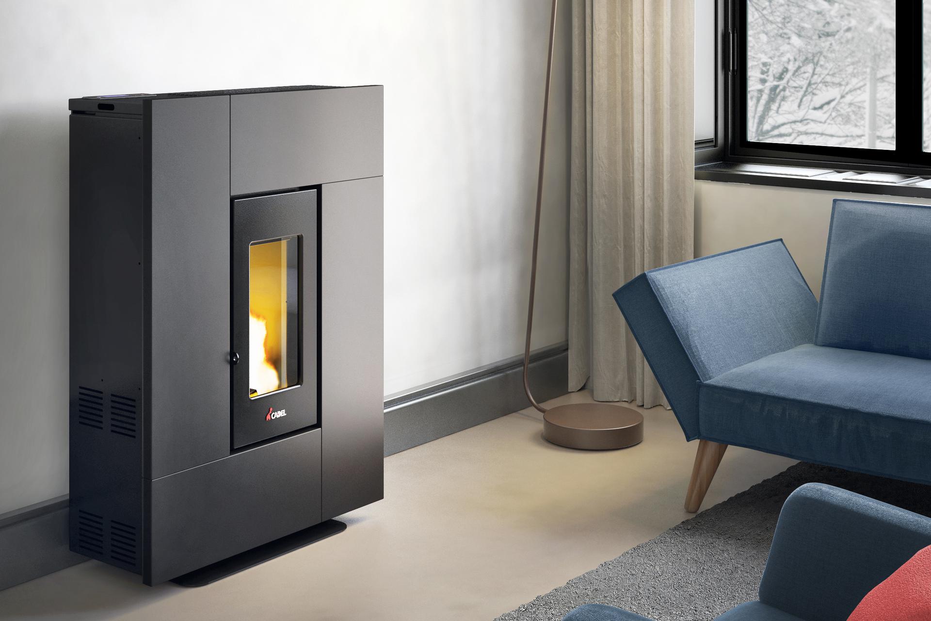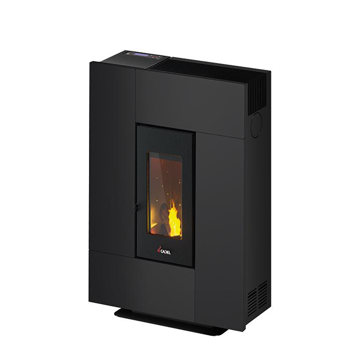 A pellet stove that decorates. The elegant and contemporary design of this stove makes it particularly suitable for small spaces, thanks to its depth of only 27.5 cm. Available as part of a practical kit for wall-to-wall installation. The cover is made of painted steel.