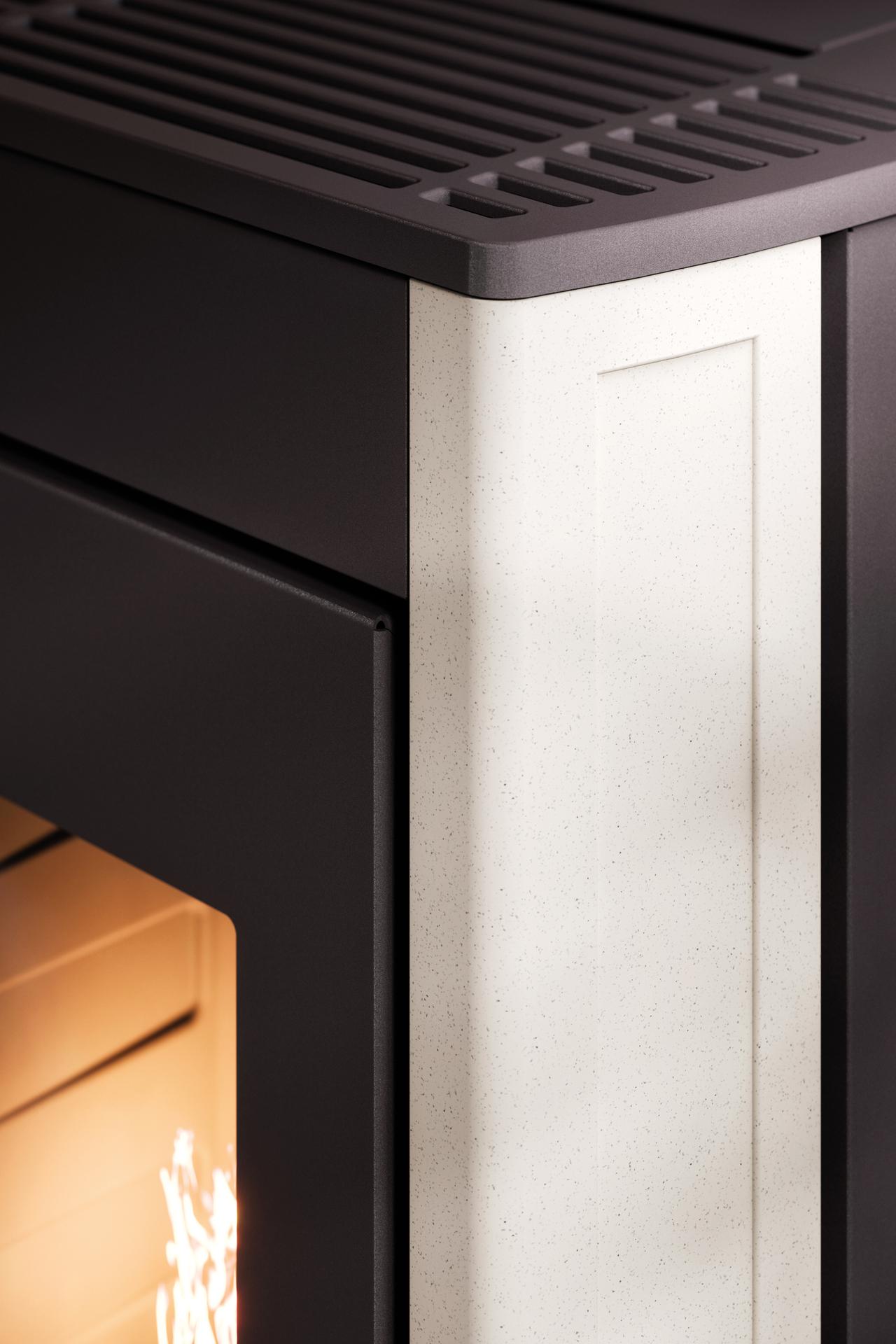 Peč na pelete Cadel Perla je dobila novo podobo z novimi oblogami z jeklenimi stranicami in novimi oblikami za litoželezno ploščo, dodana pa je tudi inovativno kurišče. Hermetična komora je standardna. Prevleka je iz lakiranega jekla.