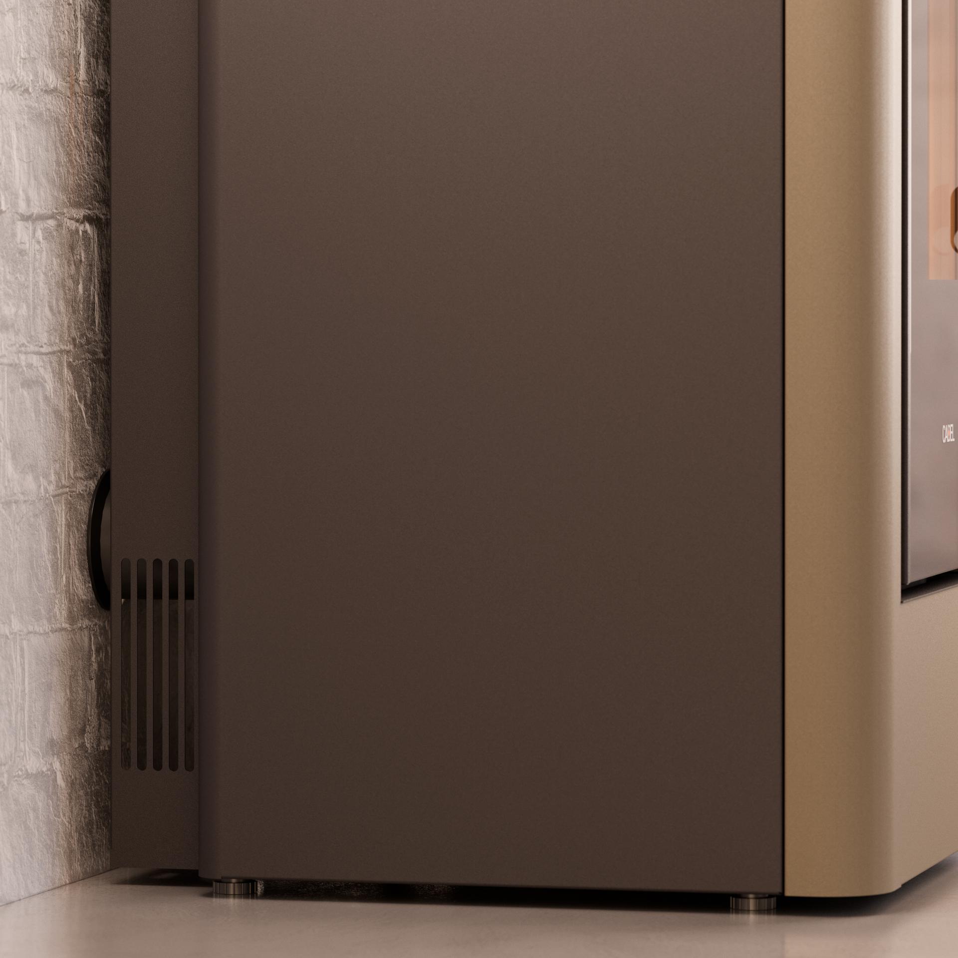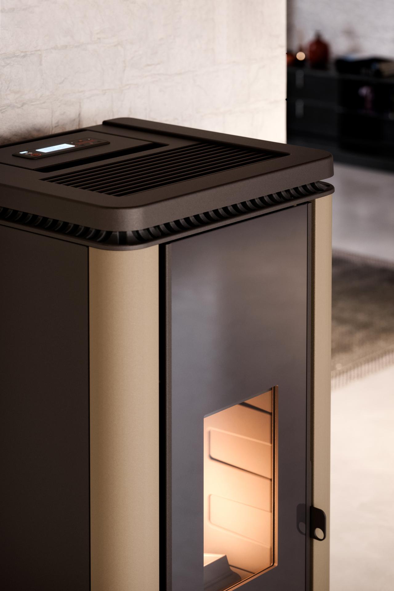 Peč z razvodom toplega zraka in sodobnim dizajnom s preprostimi linijami je opremljena s širokimi steklenimi vrati in originalnim litoželeznim pokrovom. Nova tehnologija Flexit omogoča večjo prilagodljivost pri odvajanju dima in napeljavi kanalov, zaradi okoljskega certifikata "4 zvezdice čistega zraka" in 5 zvezdic za emisije pa je upravičena do subvencij za ogrevanje. Obloga je iz pobarvanega jekla.