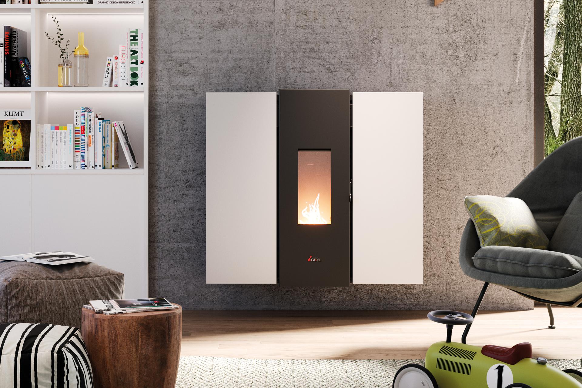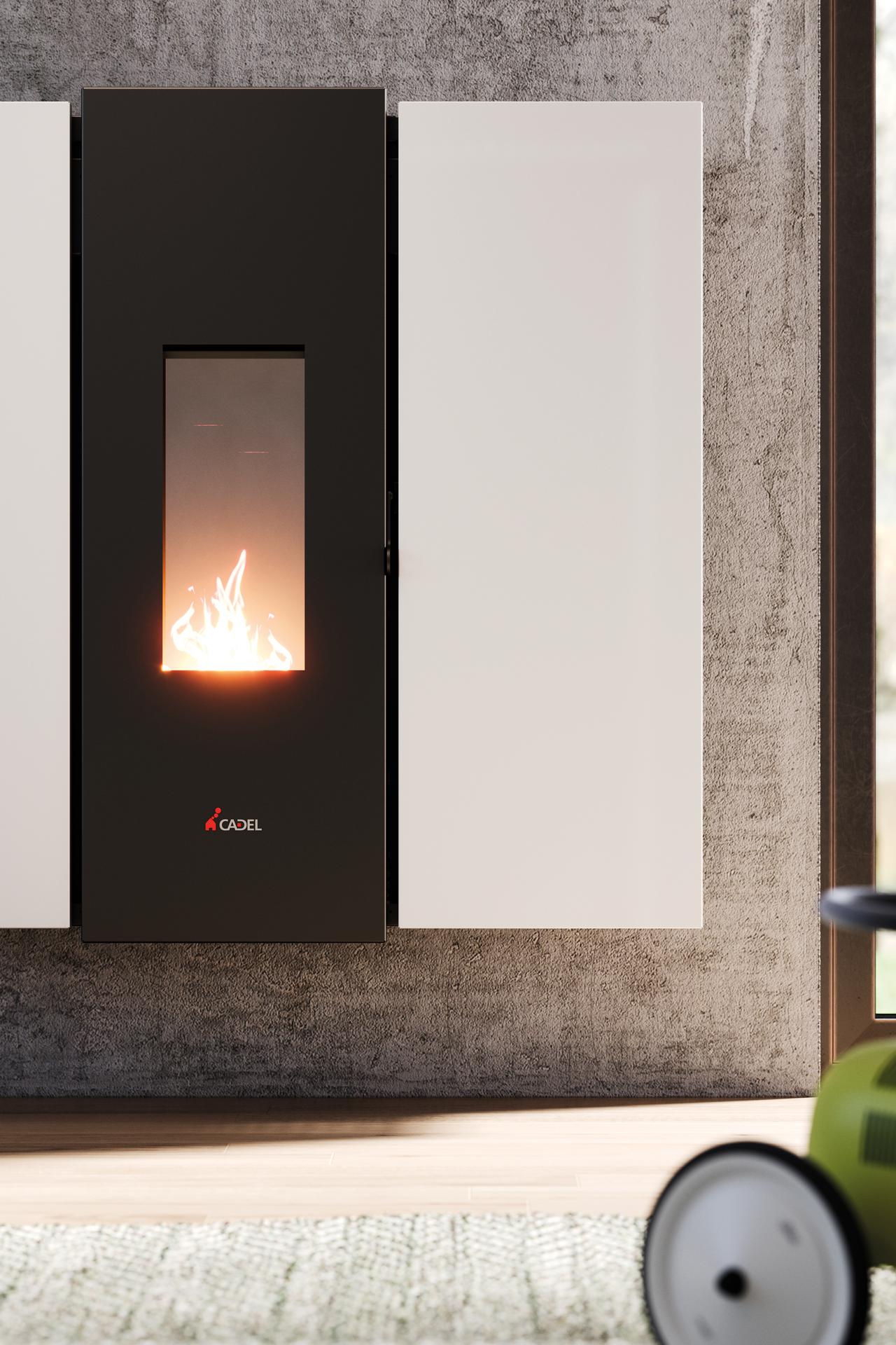 Peč na pelete z minimalistično zasnovo in globino zgolj 29 cm.
