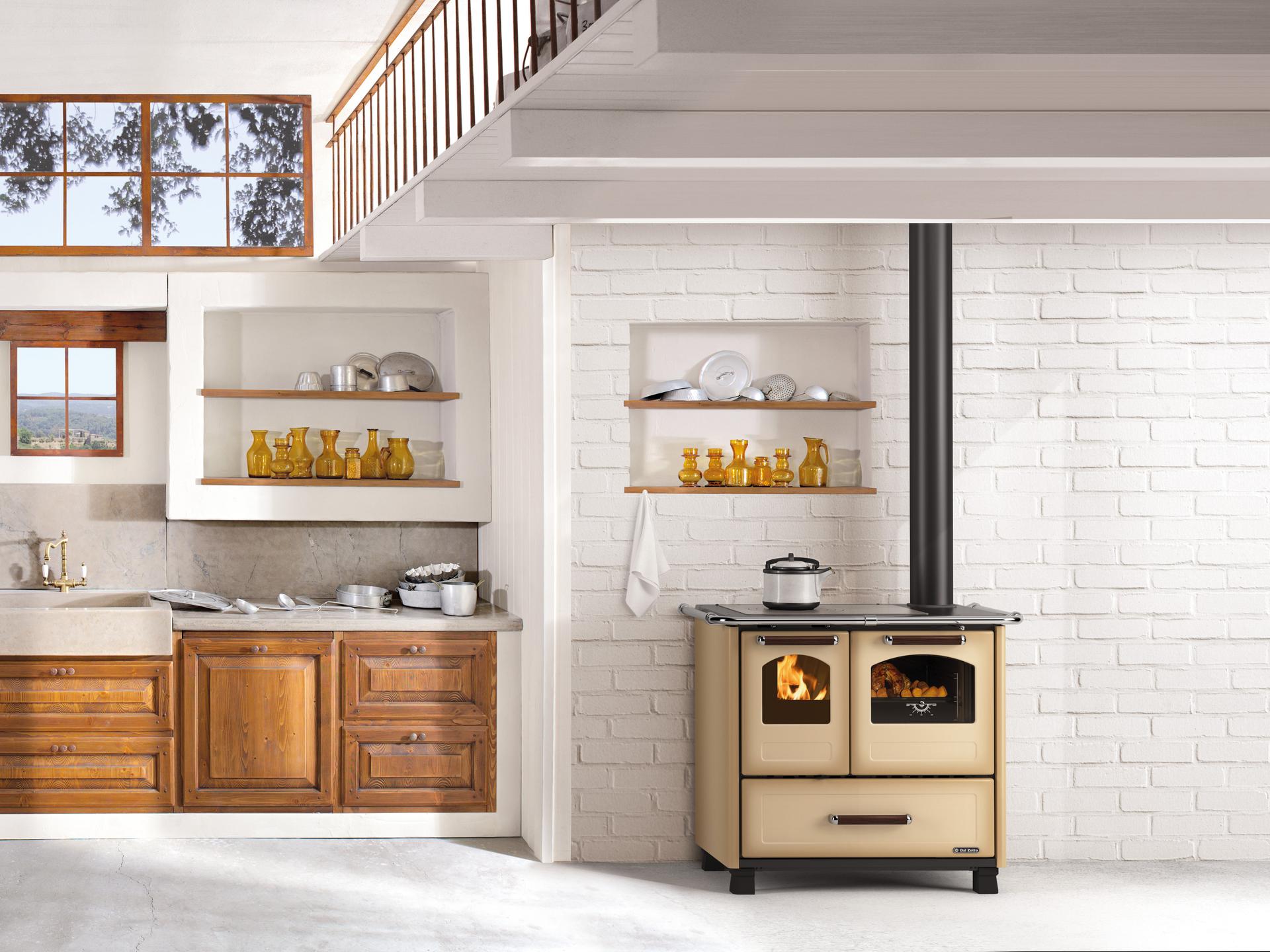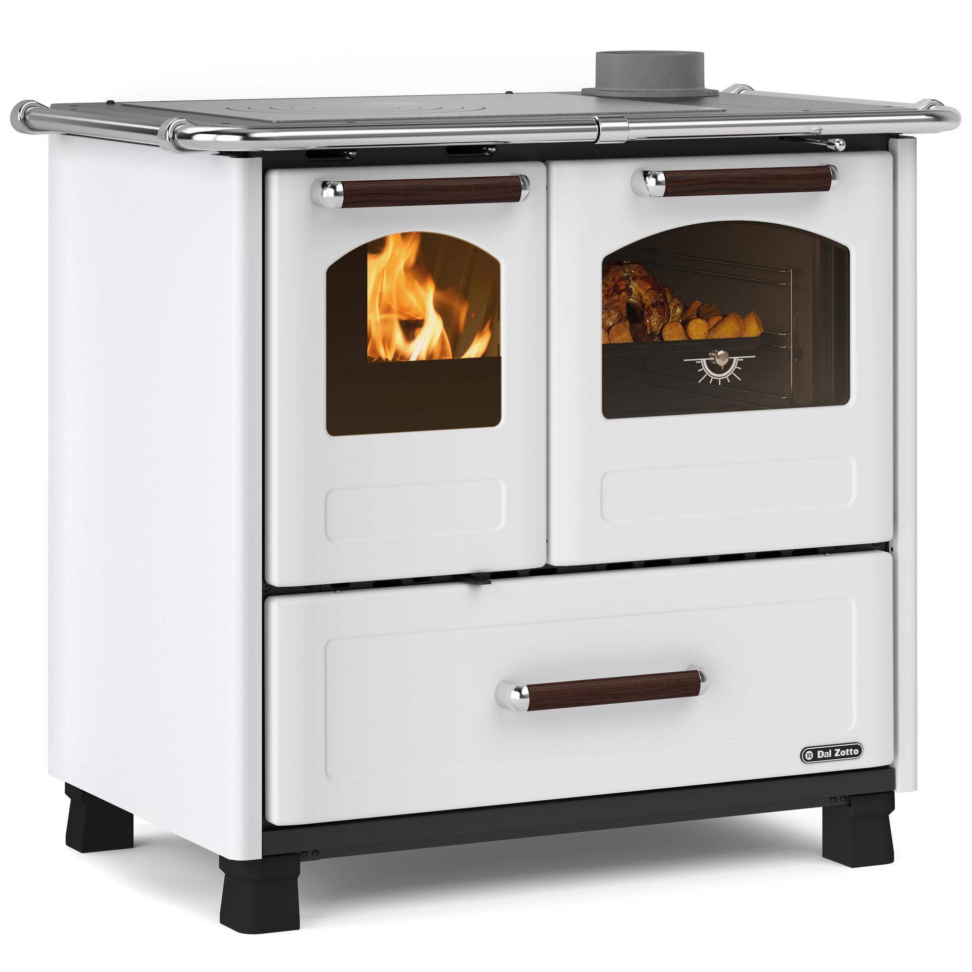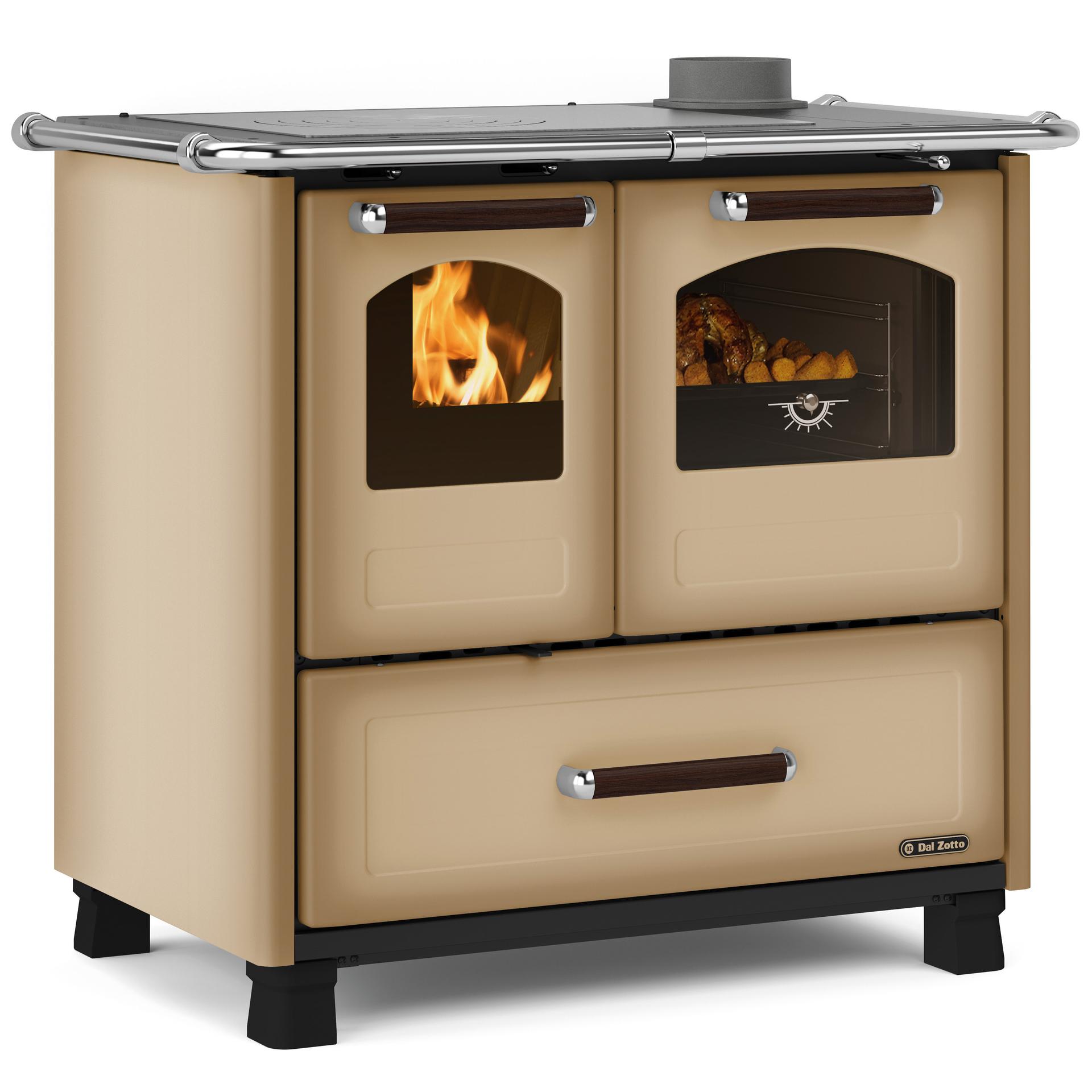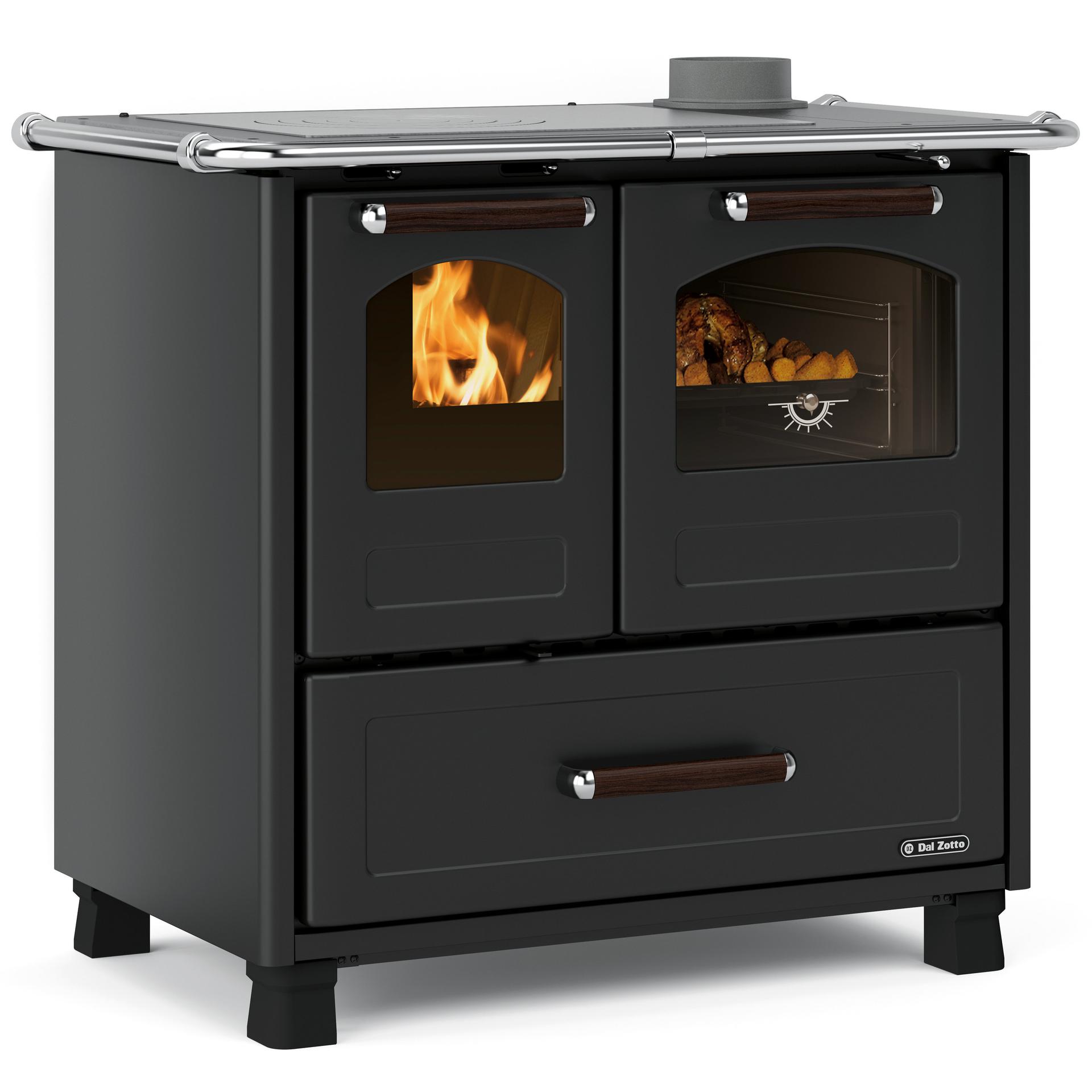 Štedilnik na drva s panoramskimi vrati kurišča in emajlirano pečico z dvojnim steklom.