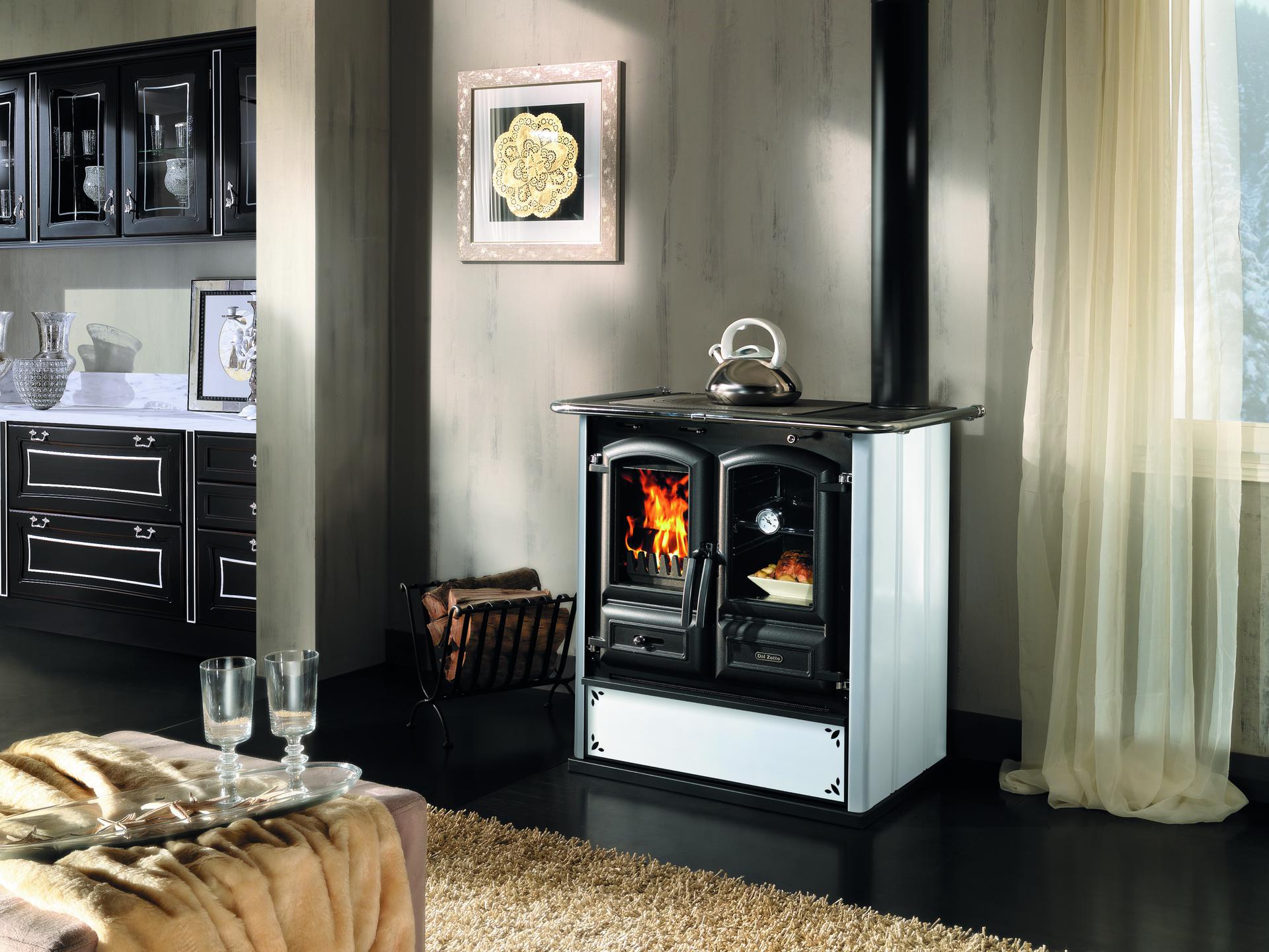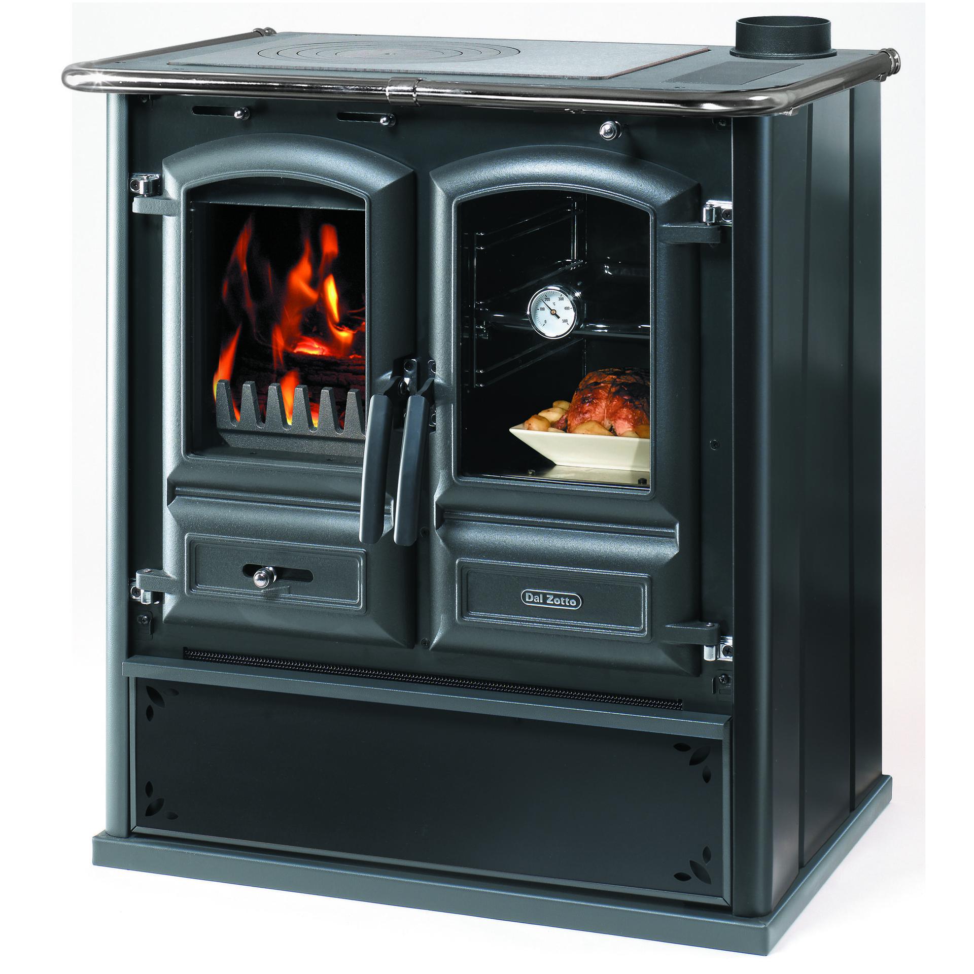 Štedilnik na drva z jekleno oblogo. Veliko ognjišče iz litega železa s panoramskimi vrati iz litega železa in keramičnim steklom. Panoramska pečica in velik predal za drva. Litoželezna plošča dvojne debeline.