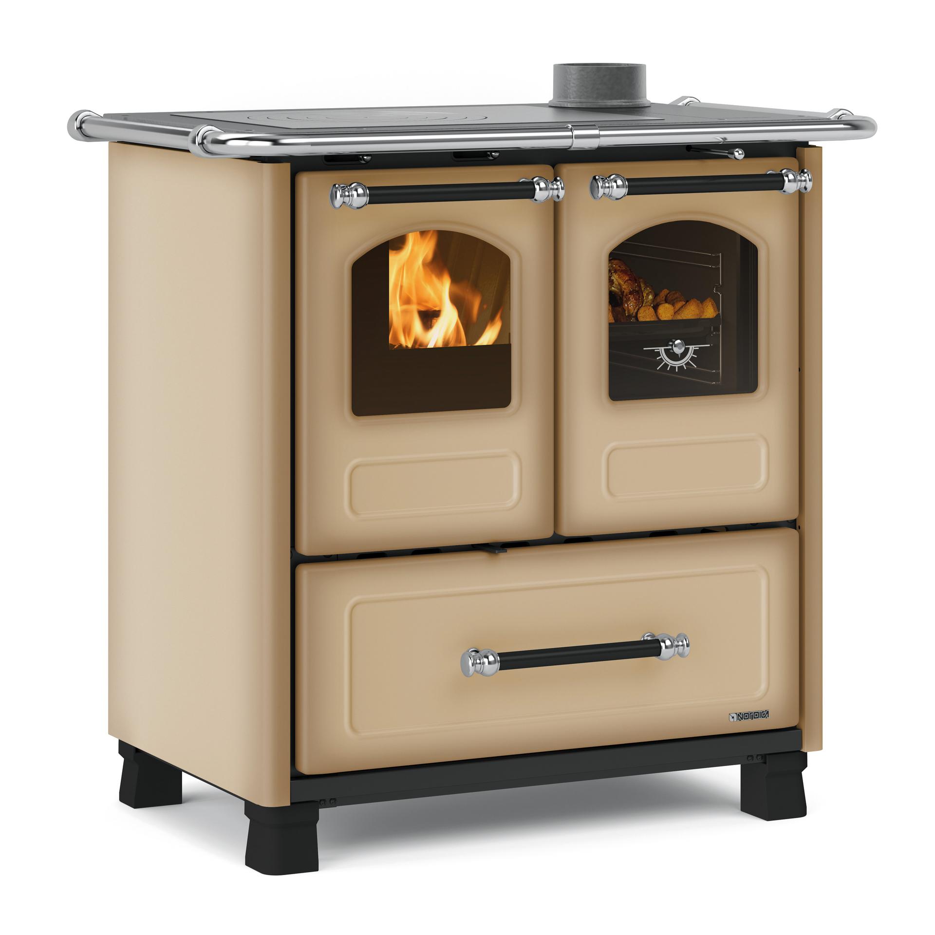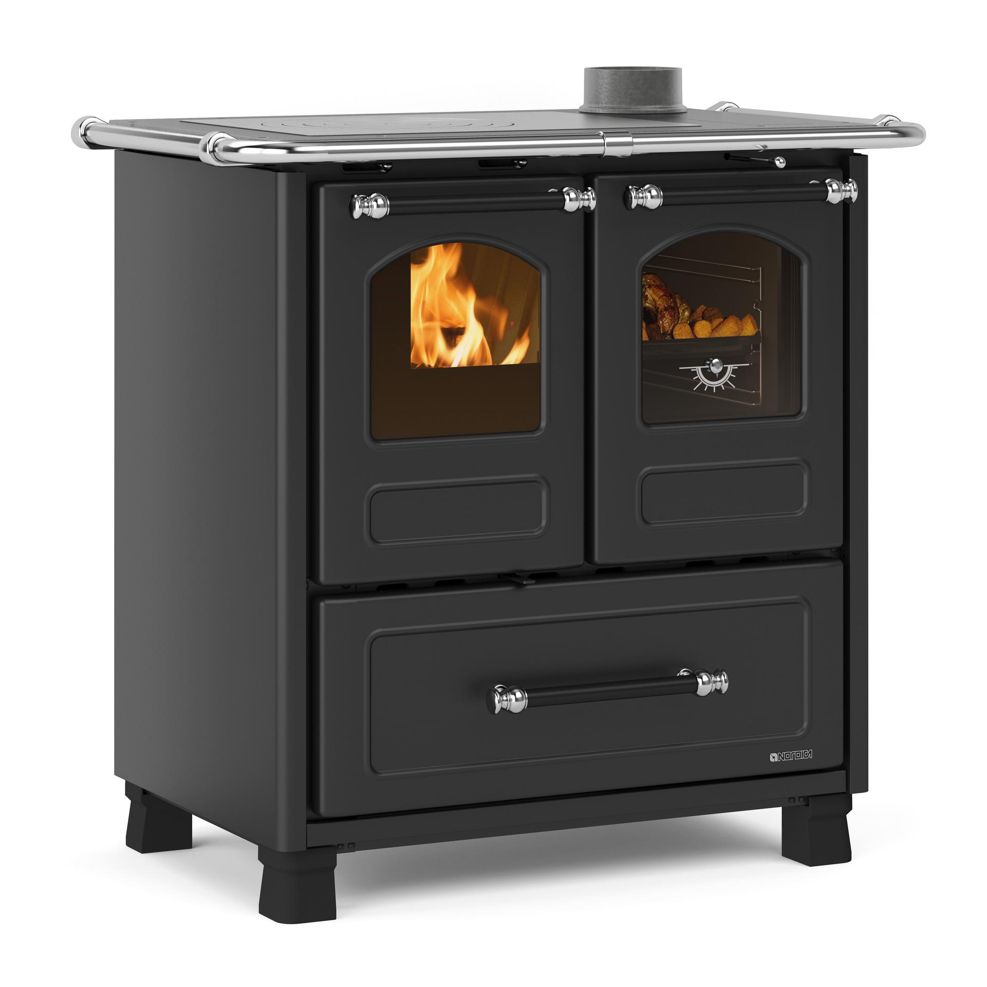 Tradicionalni štedilnik na drva z nogicami za lažje čiščenje. Emajlirana litoželezna obloga in okvir. Notranja obloga kurišča iz litega železa z izvlečnim predalom za pepel. Vrata kurišča iz litega železa z dvojnim steklom, pri čemer je notranje steklo iz keramike.