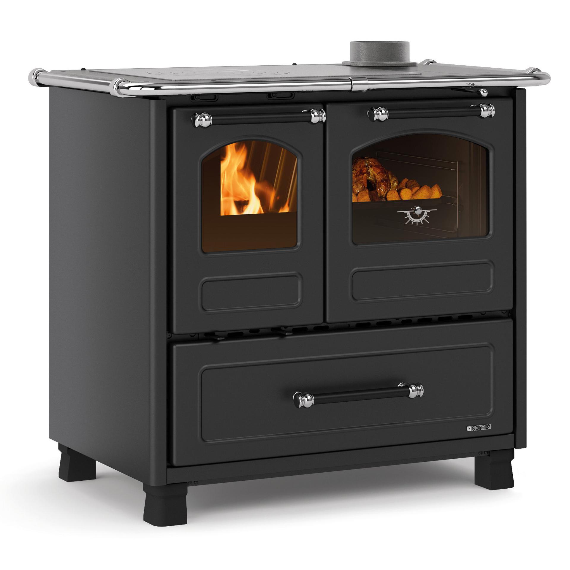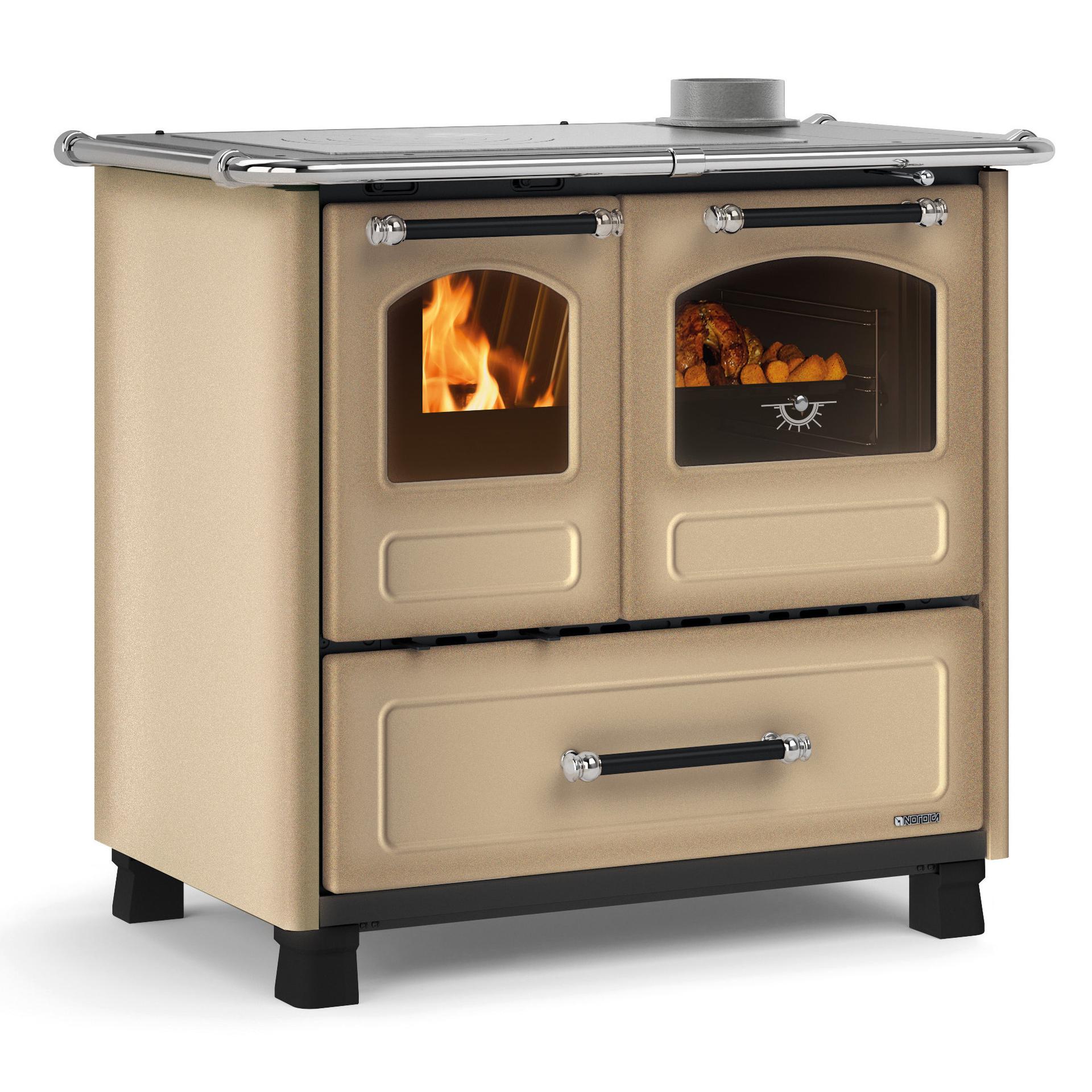 Tradicionalni štedilnik na drva z nogicami za lažje čiščenje. Emajlirana litoželezna obloga in okvir. Notranja obloga kurišča iz litega železa z izvlečnim predalom za pepel. Vrata kurišča iz litega železa z dvojnim steklom, pri čemer je notranje steklo iz keramike.