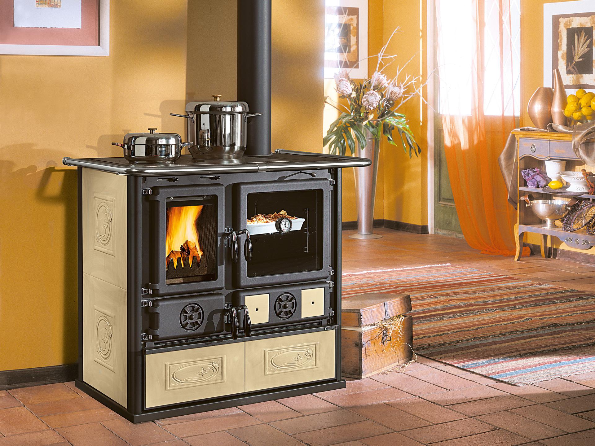 Štedilnik na drva s kuhalno ploščo in obroči iz poliranega litega železa. Vrata in okvir iz emajlirane litine. Notranja obloga kurišča iz litega železa. Nastavljiv primarni in sekundarni zrak za boljši nadzor zgorevanja in nizke emisije.