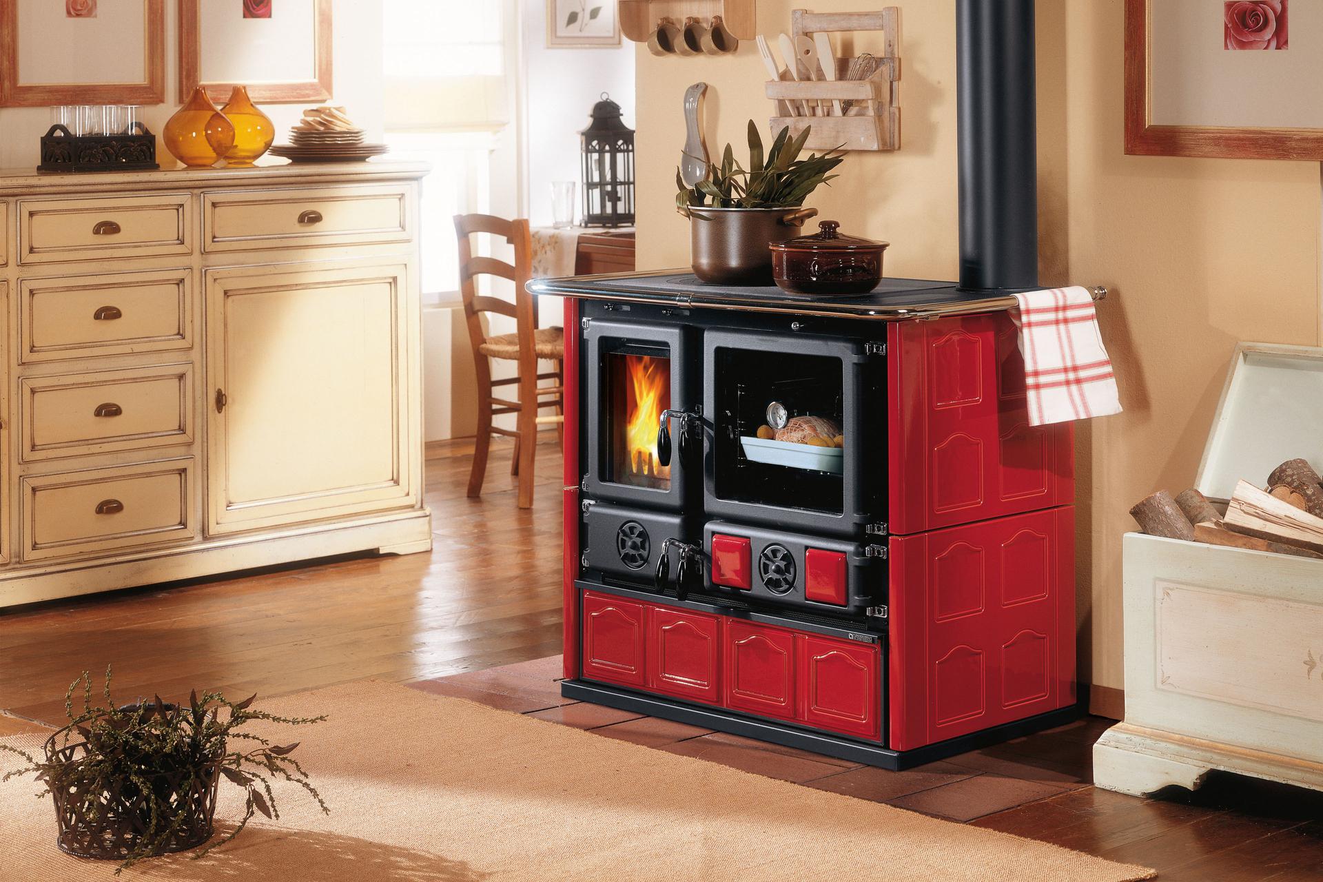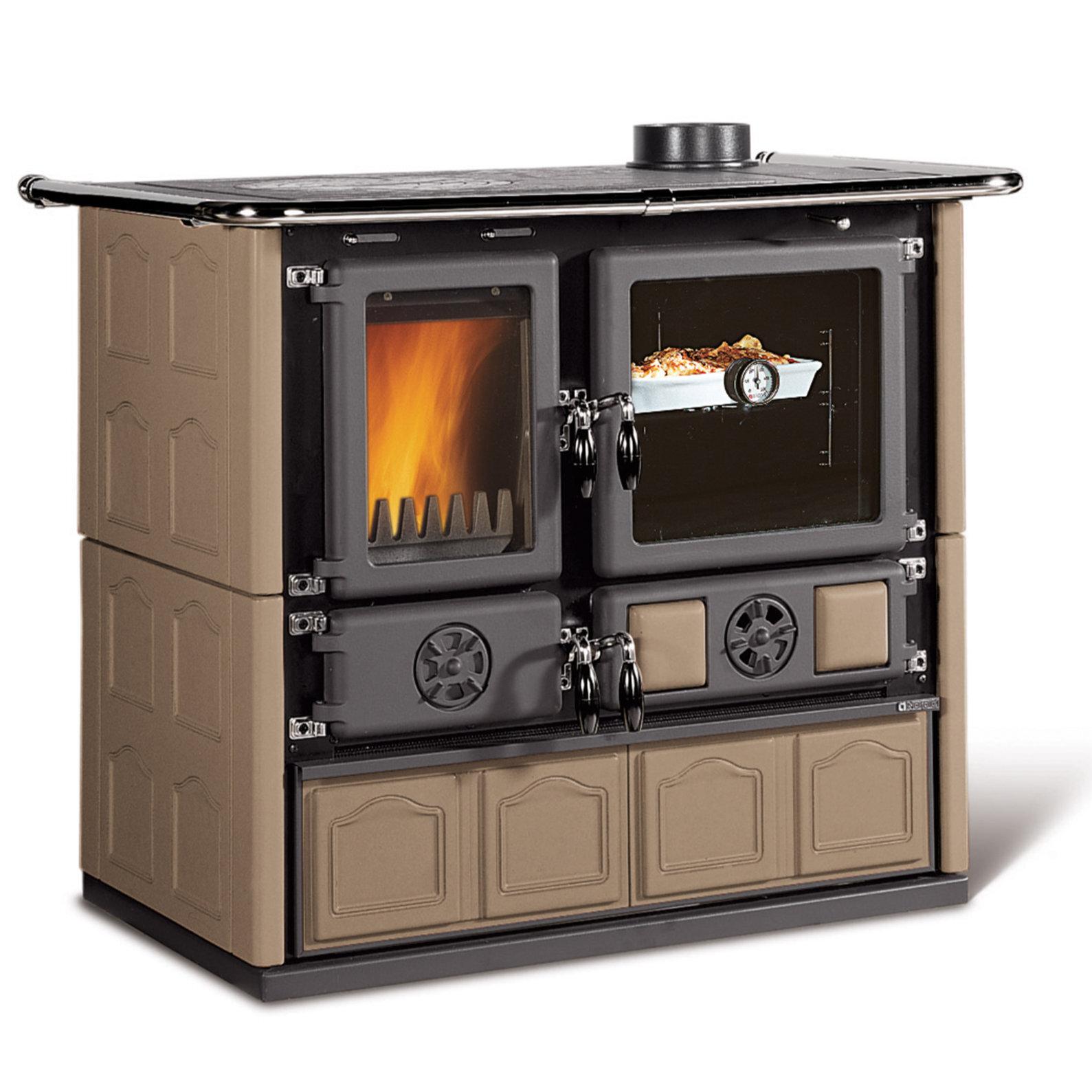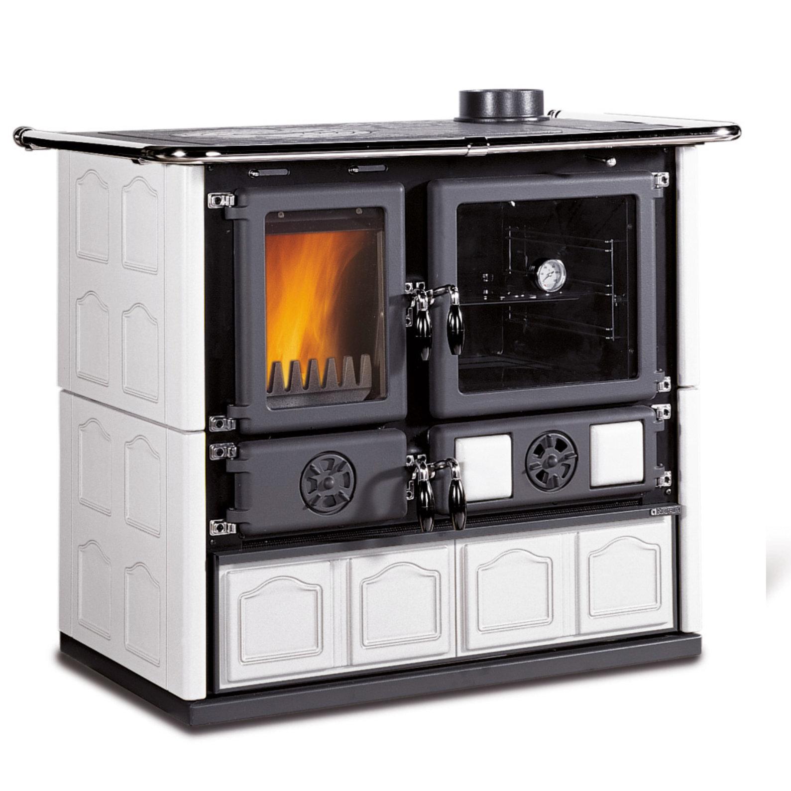 Štedilnik na drva s tradicionalno obliko in oblogo iz majolike. Zgornja plošča in obroči so iz poliranega litega železa. Vrata in okvir sta iz emajliranega litega železa. Prostorna pečica je iz emajliranega jekla.