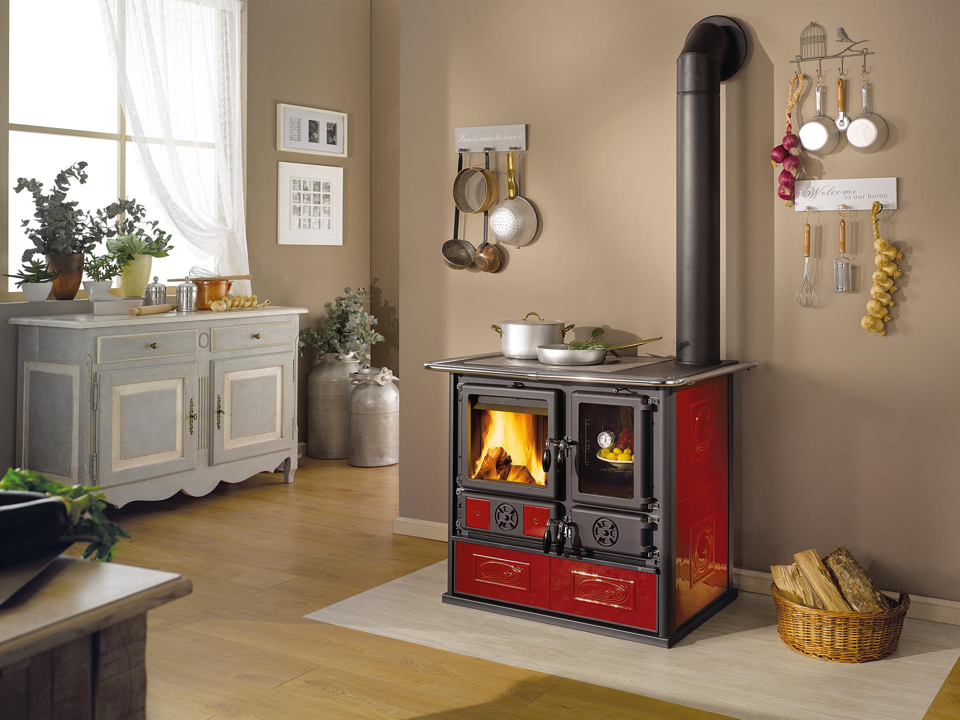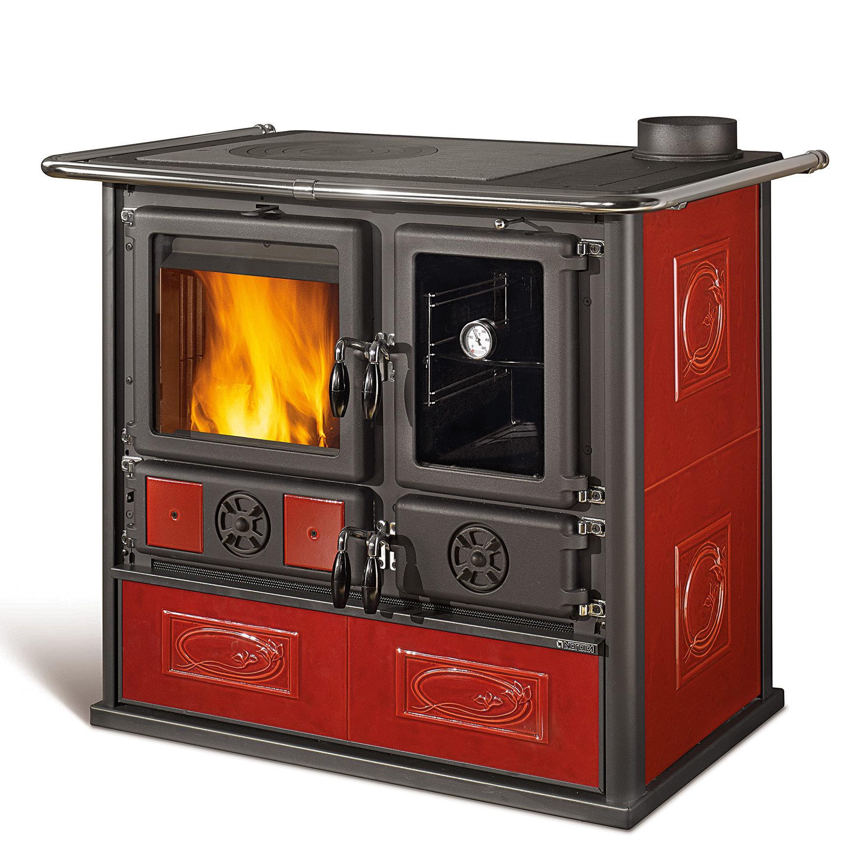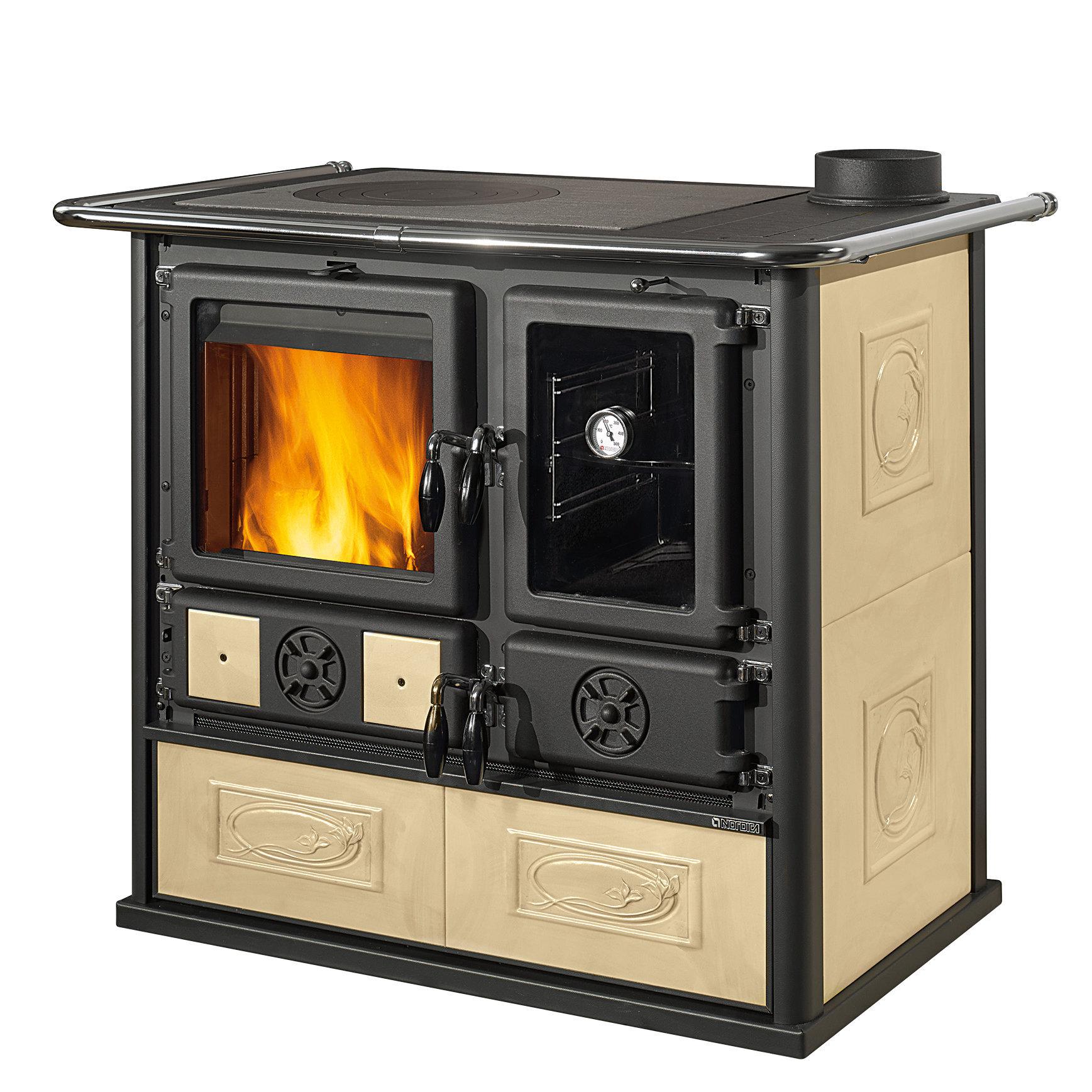 Štedilnik na drva s širokim pogledom na ogenj. Kuhalna plošča in obroči iz poliranega litega železa. Notranja obloga kurišča iz litega železa in ognjevzdržnega materiala. Izvlečni predal za drva. Vrata kurišča iz litega železa z dvojnim steklom. Serijsko priložen komplet 2 črnih ploščic 10x10 cm.