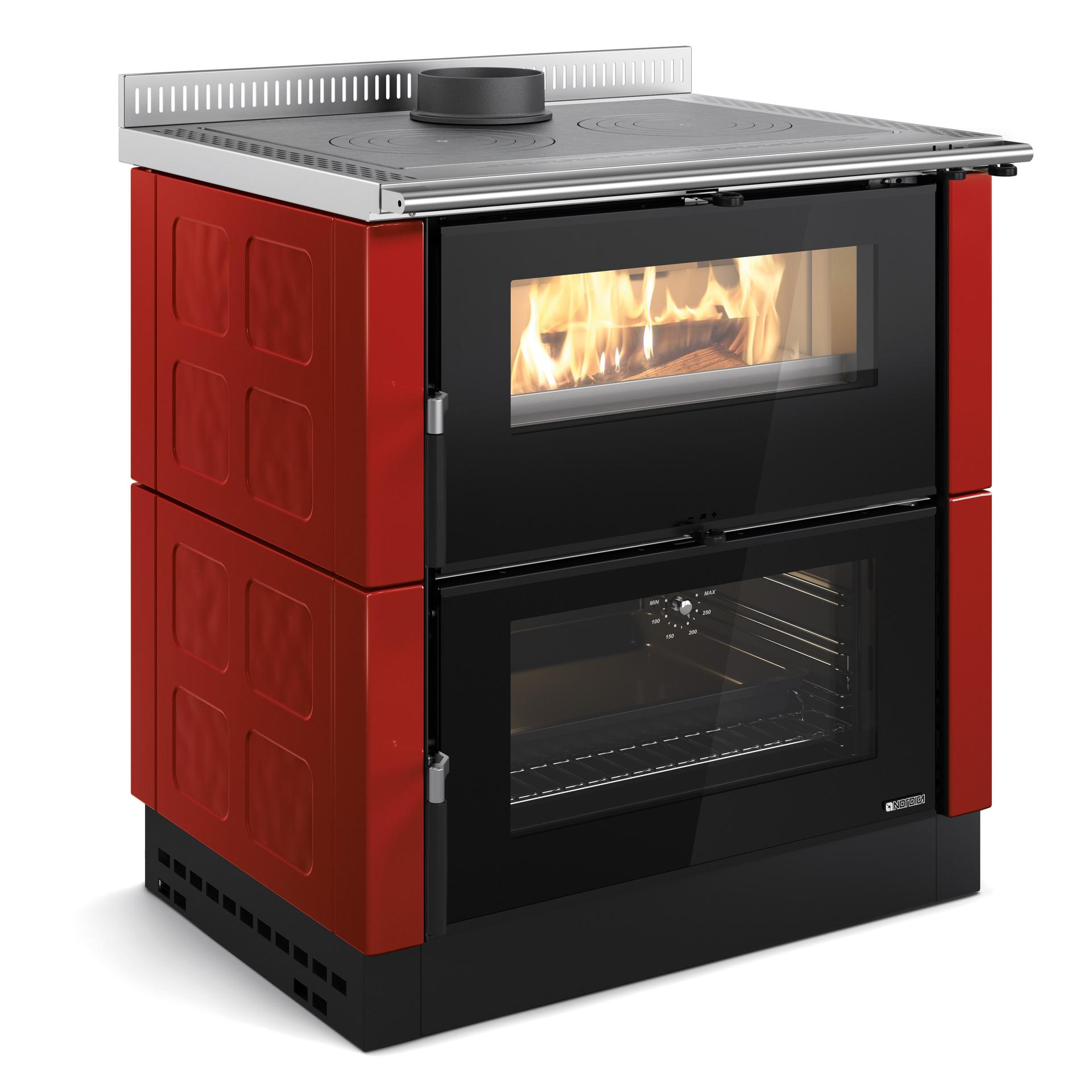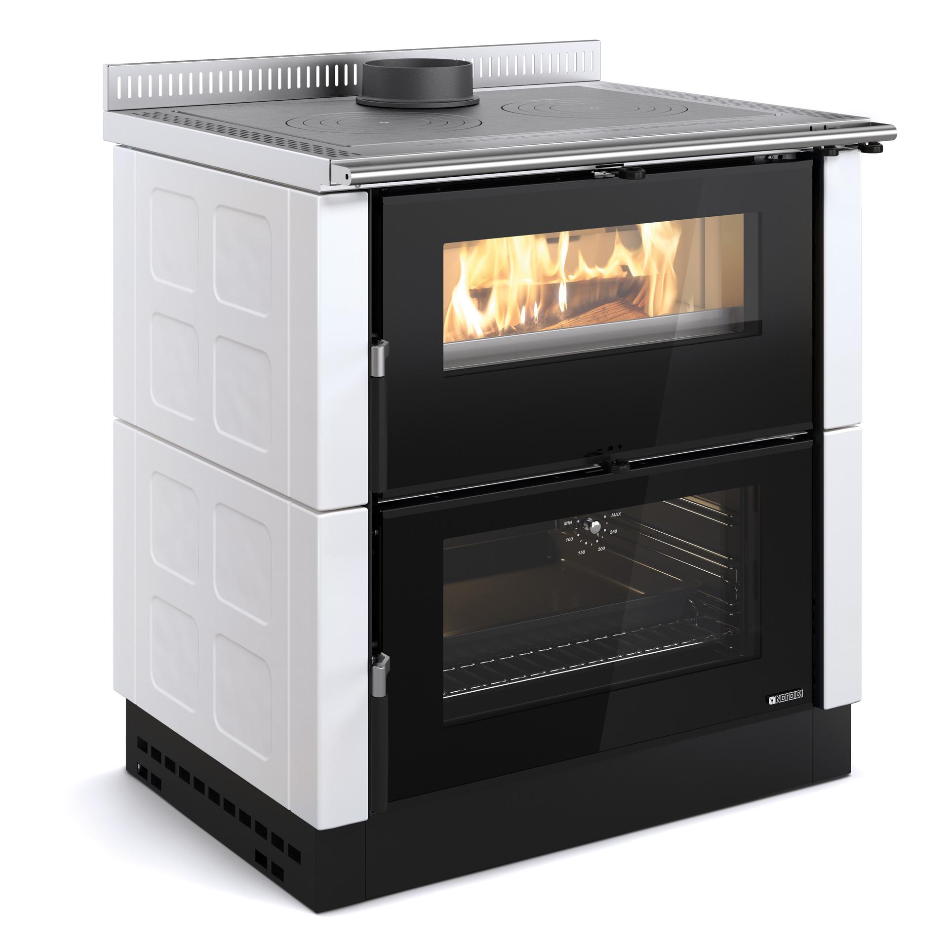 Prostostoječi štedilnik na drva s širokim pogledom na ogenj in možnostjo uporabe 50 cm dolgih polen. Zunanja obloga v majoliki. Notranja obloga kurišča iz litega železa in Nordikerja. Kuhalna plošča in obroči iz poliranega litega železa. Litoželezna vrata kurišča, vrata pečice iz emajliranega jekla. Okvir iz nerjavečega jekla. Izvlečni predal za drva. Keramično steklo. Sprednji ročaj. Debelina pokrova 3 cm.