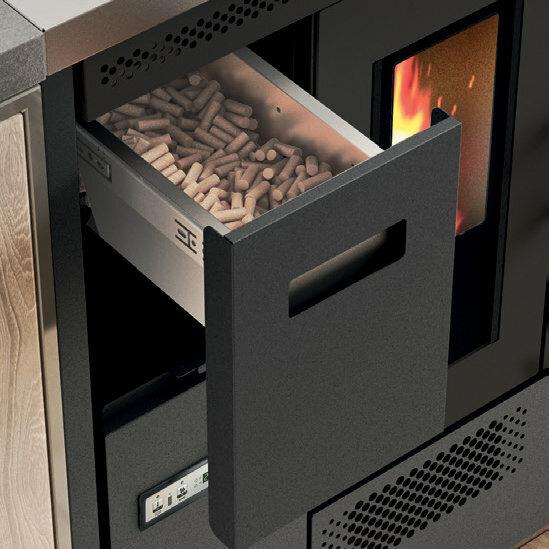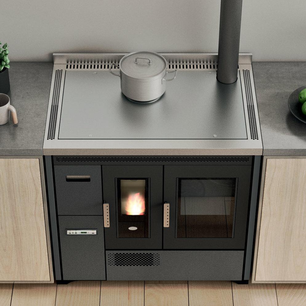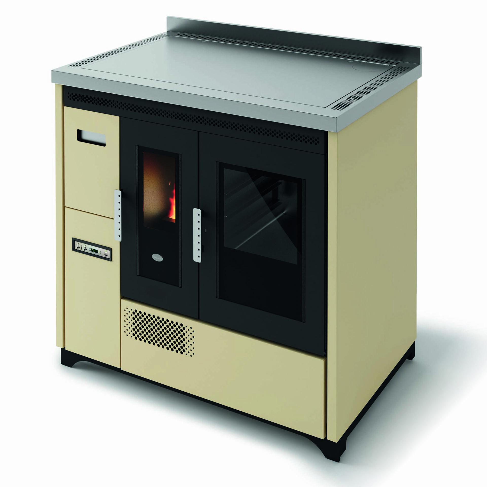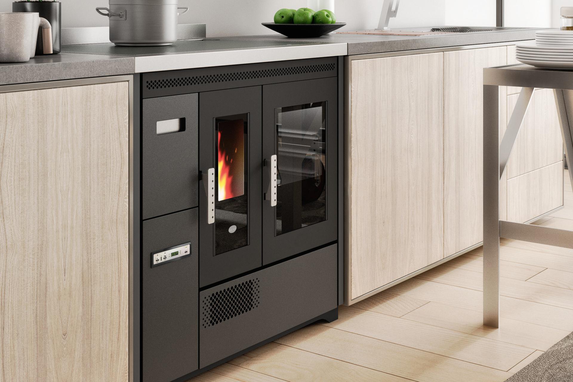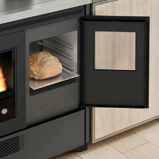 Štedilnik na pelete s pečico iz nerjavnega jekla, ki ga je mogoče namestiti kot samostojno ali vgradno enoto. Temperaturo pečice z razponom 120-230 °C je mogoče nadzorovati prek zaslona. Serijsko so priložena odstranljiva vodila za držalo pladnja, aluminijasti pladenj in držalo za pladenj. Ventilatorski vpih za distribucijo vročega zraka. Kontrolnik delovanja s 5 stopnjami moči s prikazom menija v 6 jezikih. Varnostni termostat in priključek za zunanji termostat. Litoželezna posoda kurišča, odstranljiv pepelnik in odvod dimnih plinov na zadnji in zgornji strani.