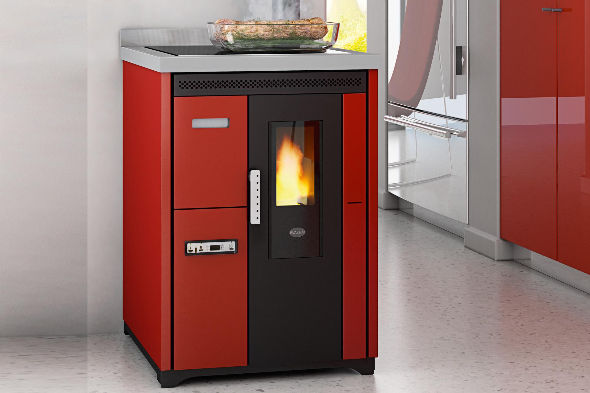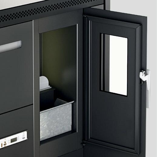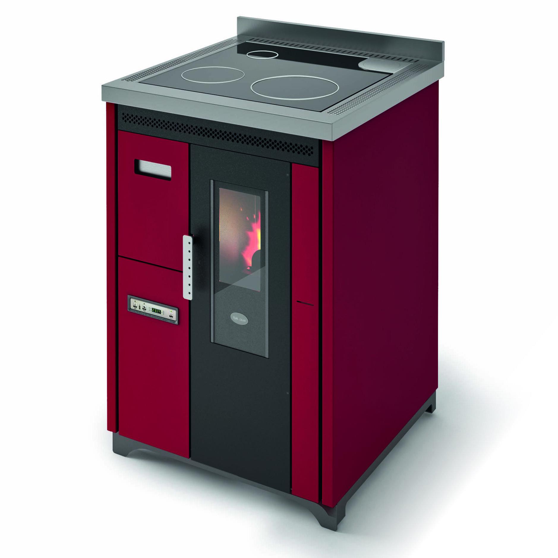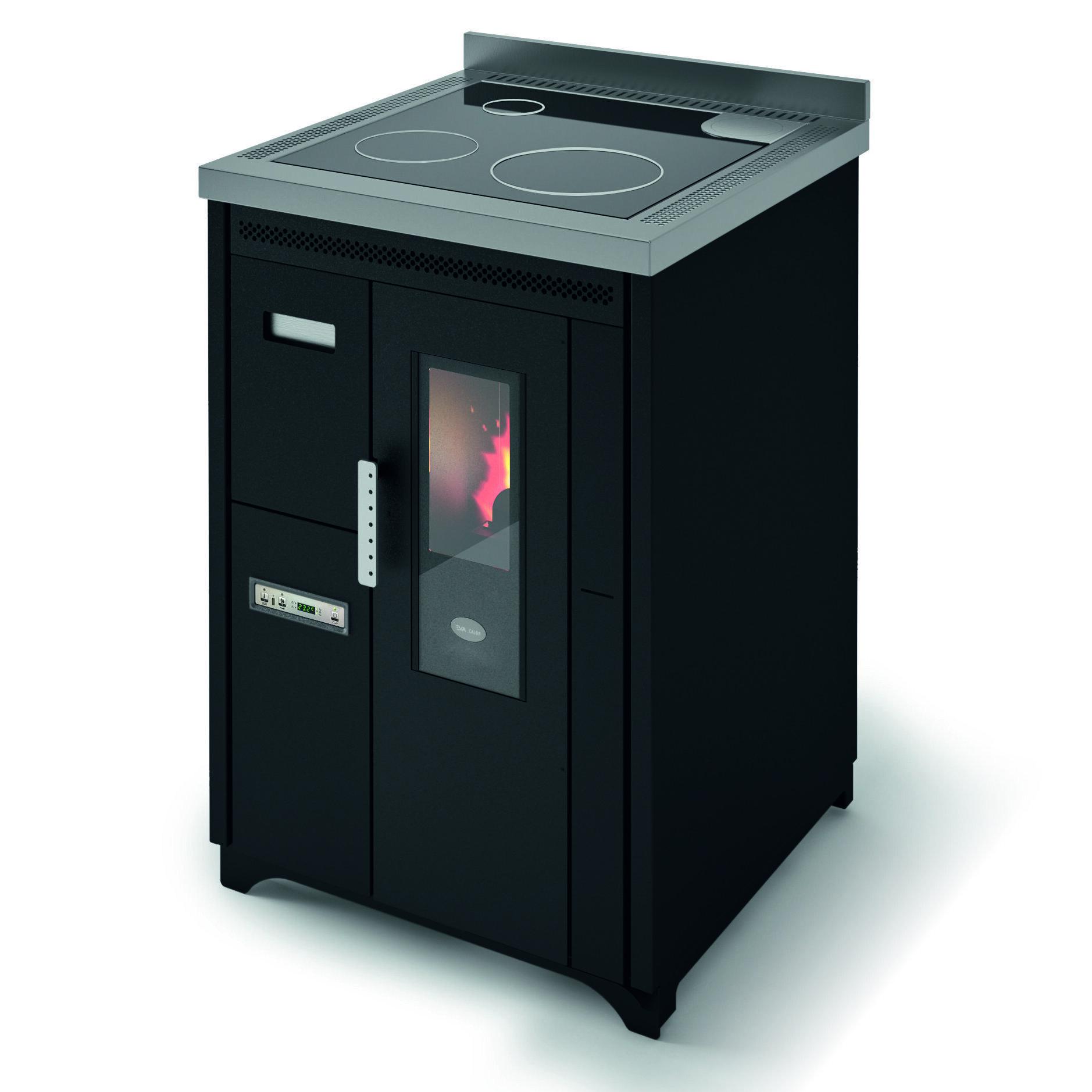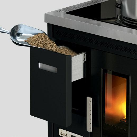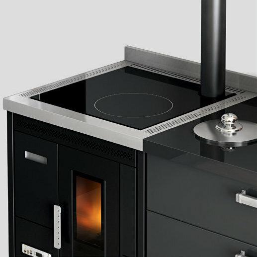 Štedilnik na pelete s kuhalno ploščo iz keramičnega stekla. Ventilatorski vpih toplega zraka je mogoče izklopiti, če ni potreben, npr. poleti. Izvlečni sprednji predal za enostavno nalaganje peletov. 10 (5+5) stopenj moči upravljate prek menijskega zaslona, ki je na voljo v 6 jezikih. Varnostni termostat in manostat z možnostjo priključitve zunanjega termostata. Priključek za dimnik na zadnji in zgornji strani, za boljše prilagajanje zahtevam namestitve.