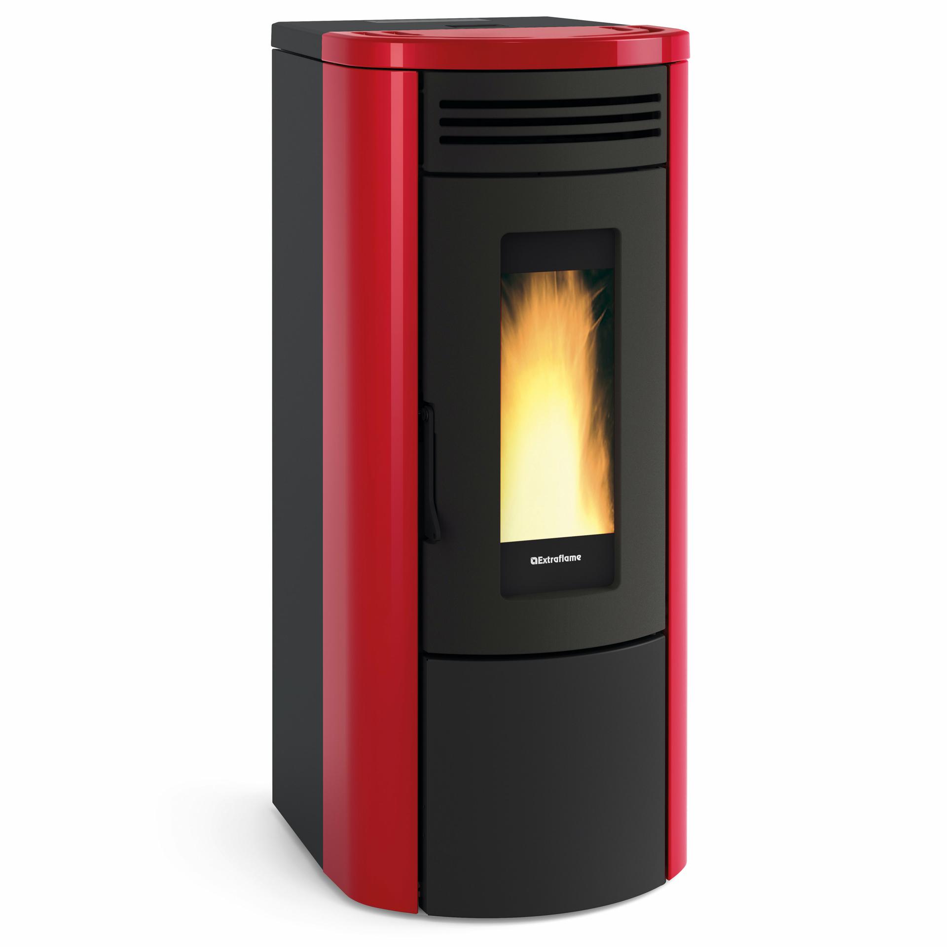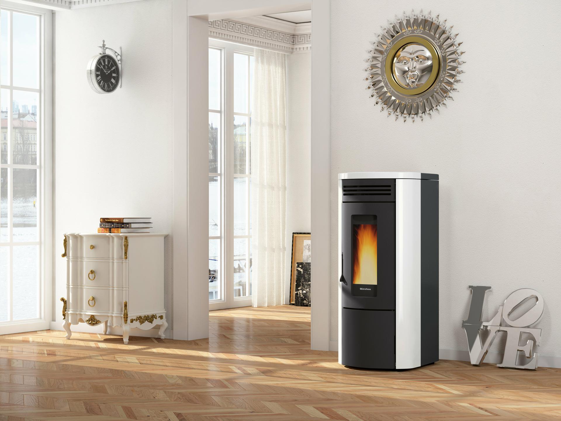 Hermetična termo peč na pelete z vpihom toplega zraka z visokotemperaturno lakirano jekleno prevleko in zgornjim pokrovom iz keramike. Čelni vpih toplega zraka namenskim motorjem, ki ga je mogoče izključiti.