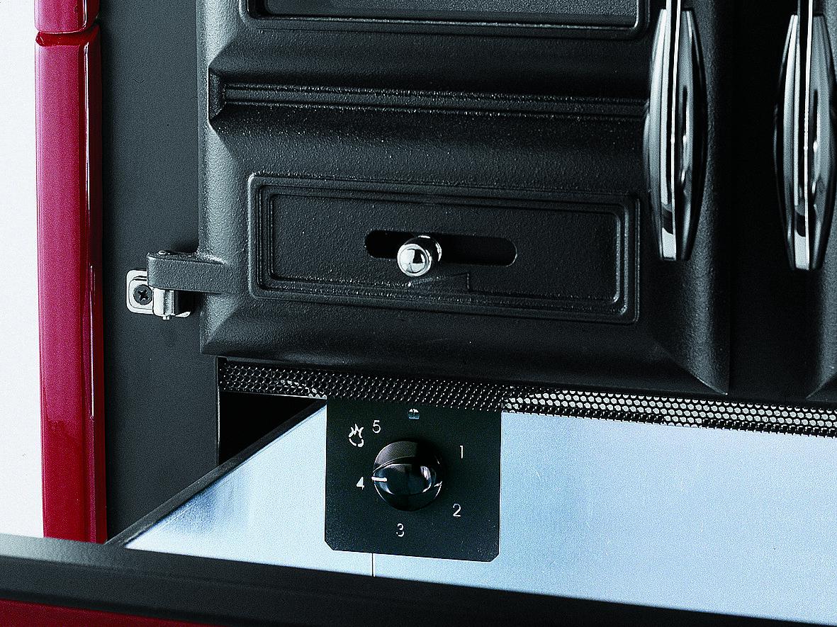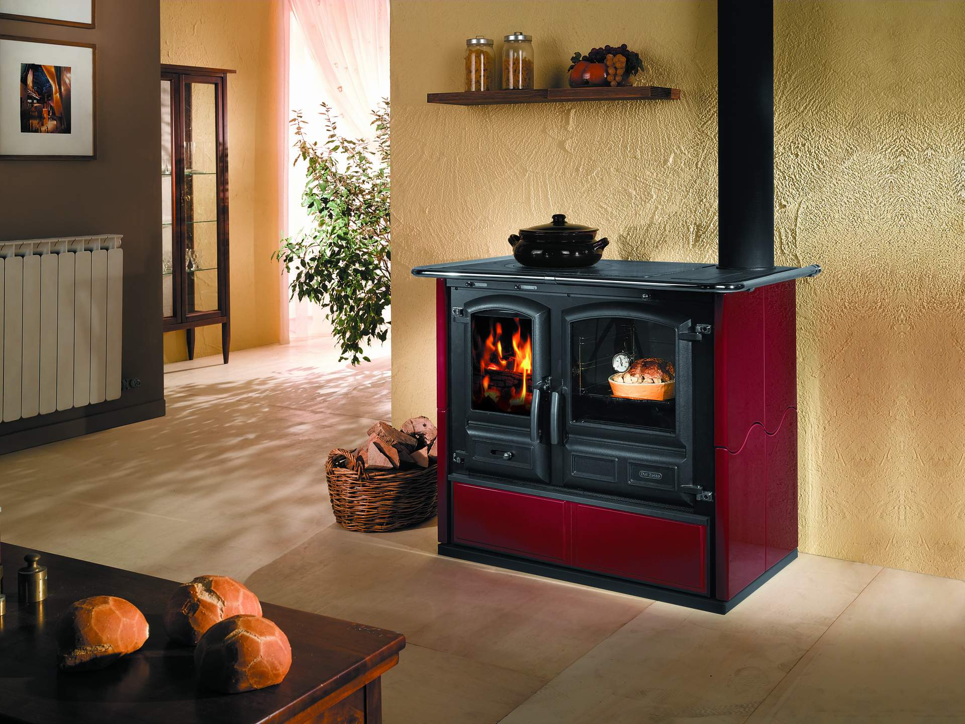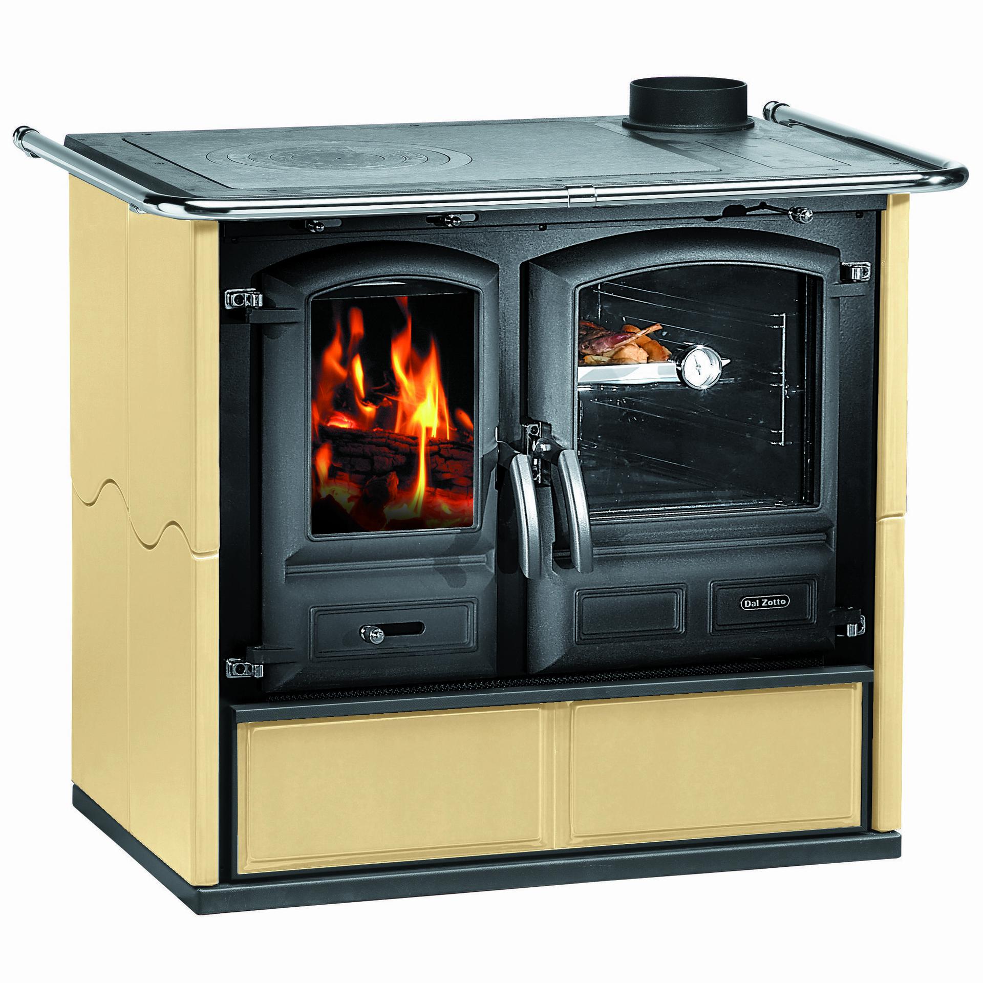 Štedilnik na drva, namenjen samostojnemu ogrevanju hiše s povezavo naprave z vodovodnim in ogrevalnim sistemom. Zunanja obloga iz majolike. Velika panoramska pečica. Dvojna debelina litoželezne plošče.