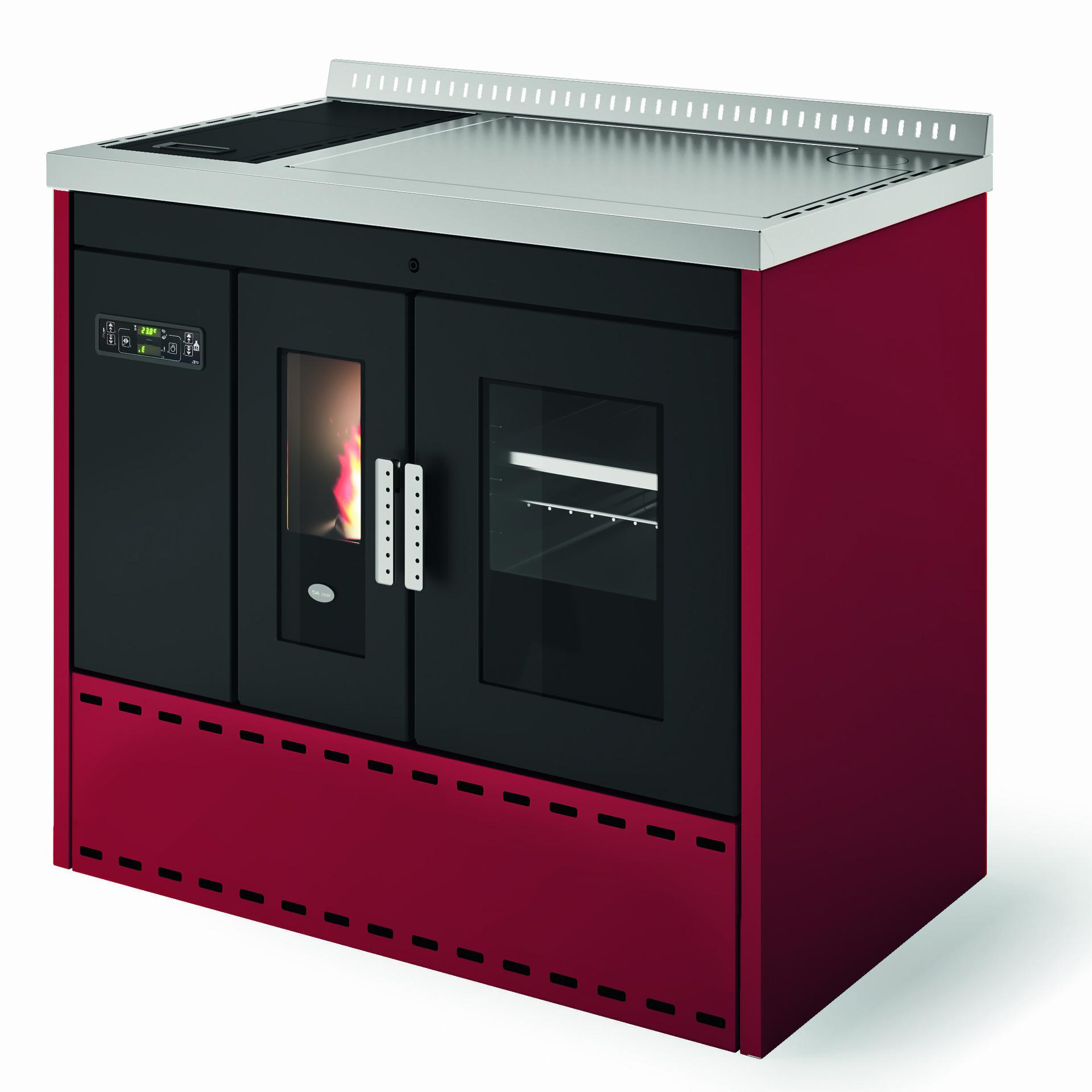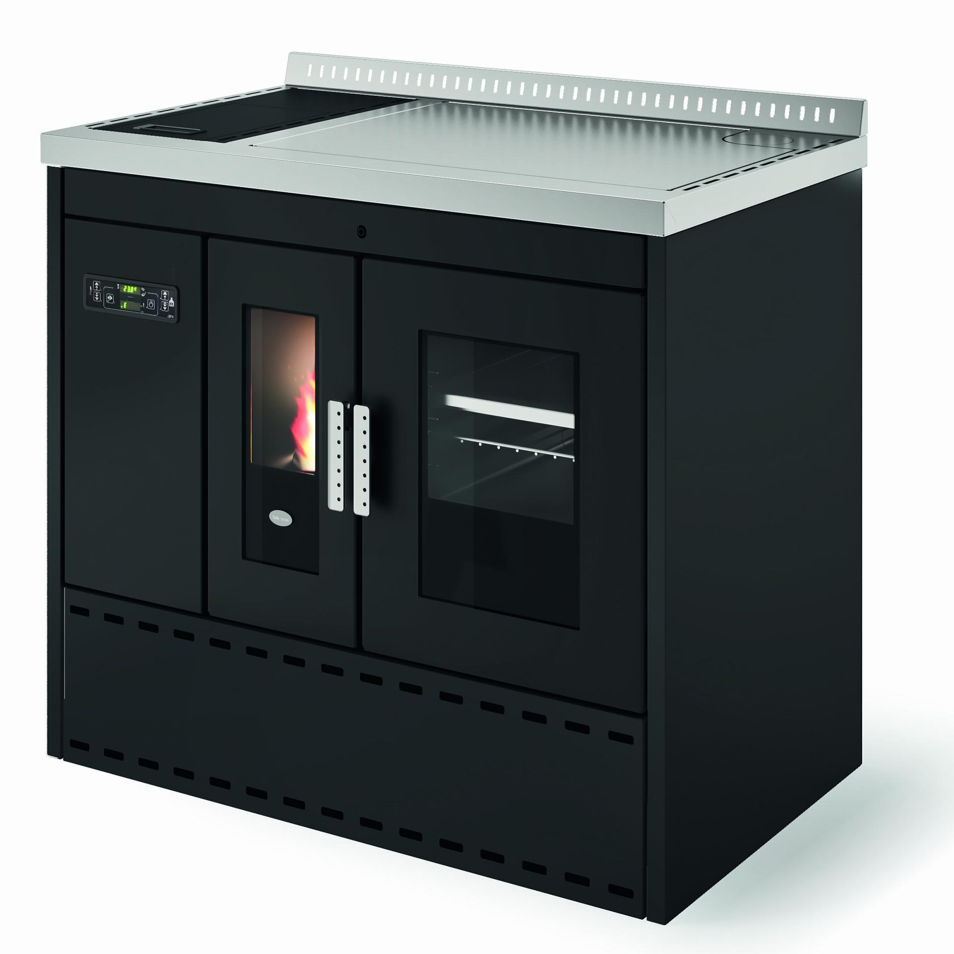 Centralno ogrevanje, udobno kuhanje in pečenje z enim samim štedilnikom na pelete. Z linearno obliko, sprednjimi vrati s črnim sitotiskanim steklom in možnostjo priključitve dimnika na zadnji ali zgornji strani je ta štedilnik na pelete enostavno integrirati v vaš stanovanjski prostor. Pečica iz nerjavnega jekla ima odstranljiva vodila za držalo pladnja, aluminijast pladenj in držalo za pladenj. Temperaturo pečenja nadzoruje zaslon z razponom od 120 do 240 °C. Za upravljanje 5 stopenj moči skrbi kontrolink z meniji v 6 jezikih. Vodni sistem je opremljen z varnostnim termostatom in manostatom, obtočno črpalko, ekspanzijsko posodo in varnostnim ventilom.