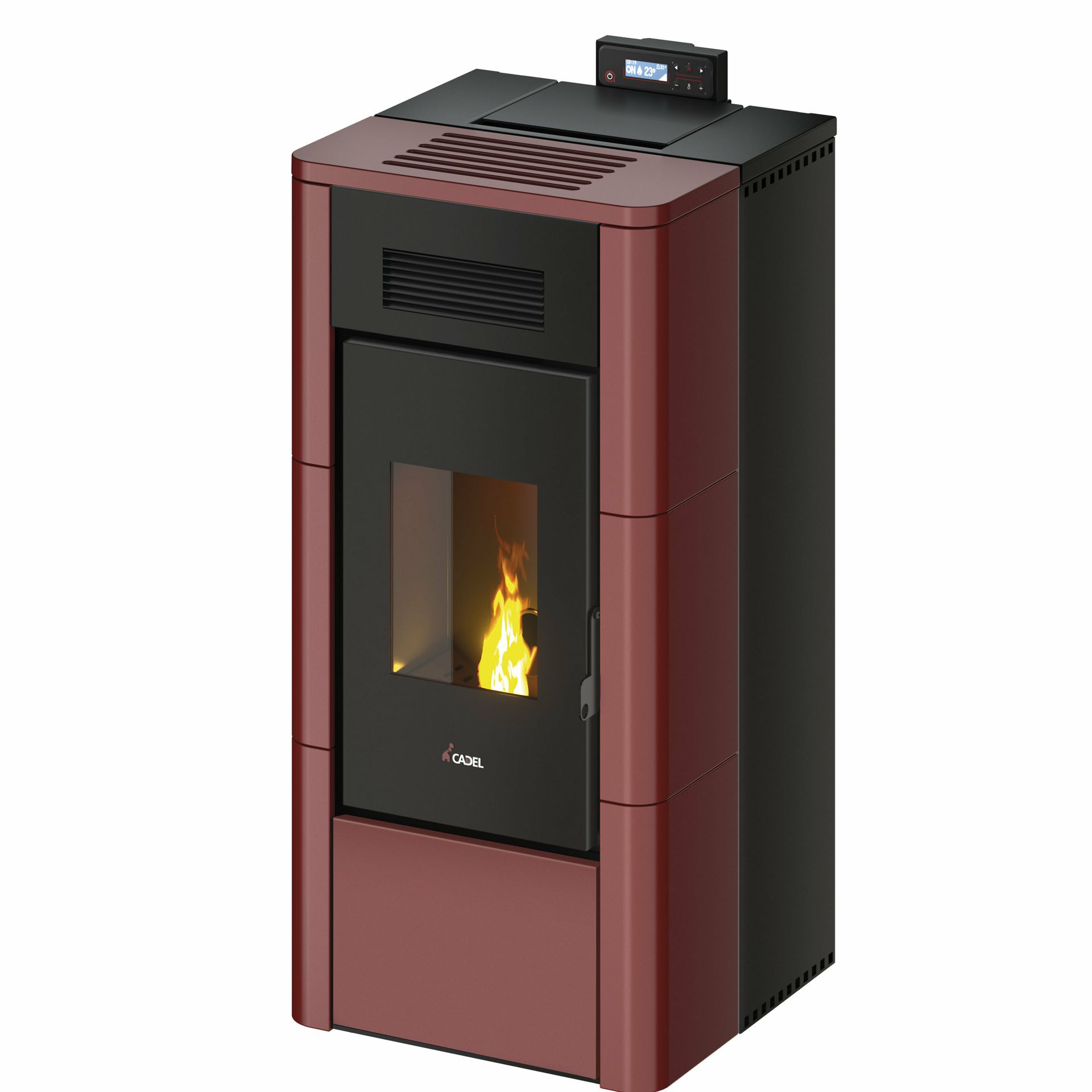 Vodna kaminska peč na pelete z minimalnim elegantnim dizajnom in zunanjo oblogo v majoliki.