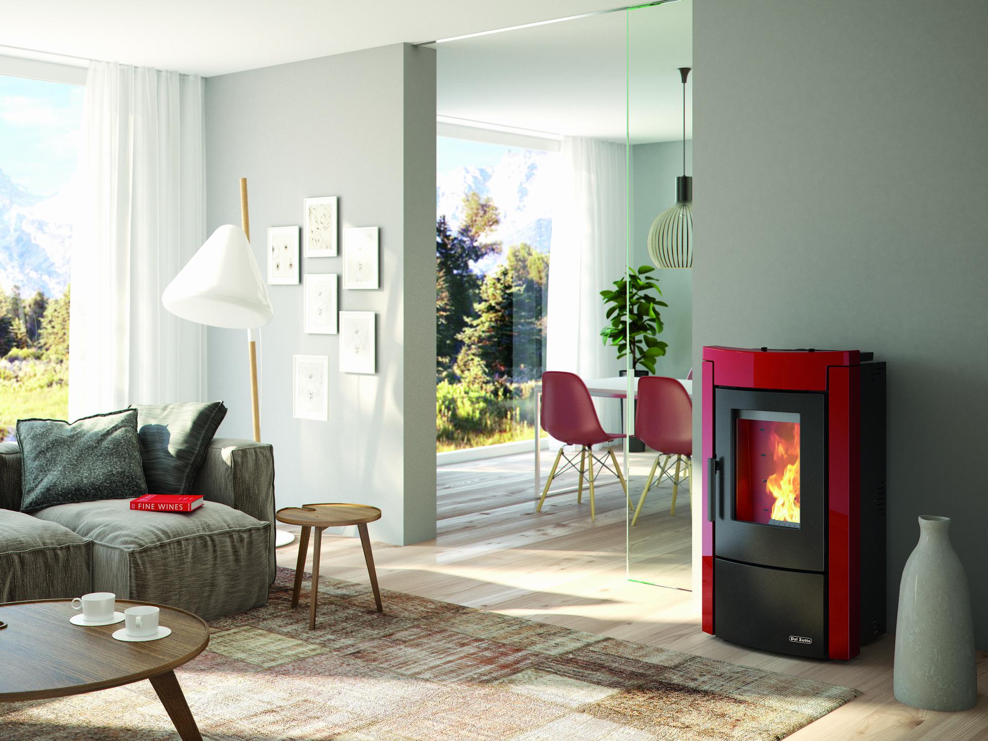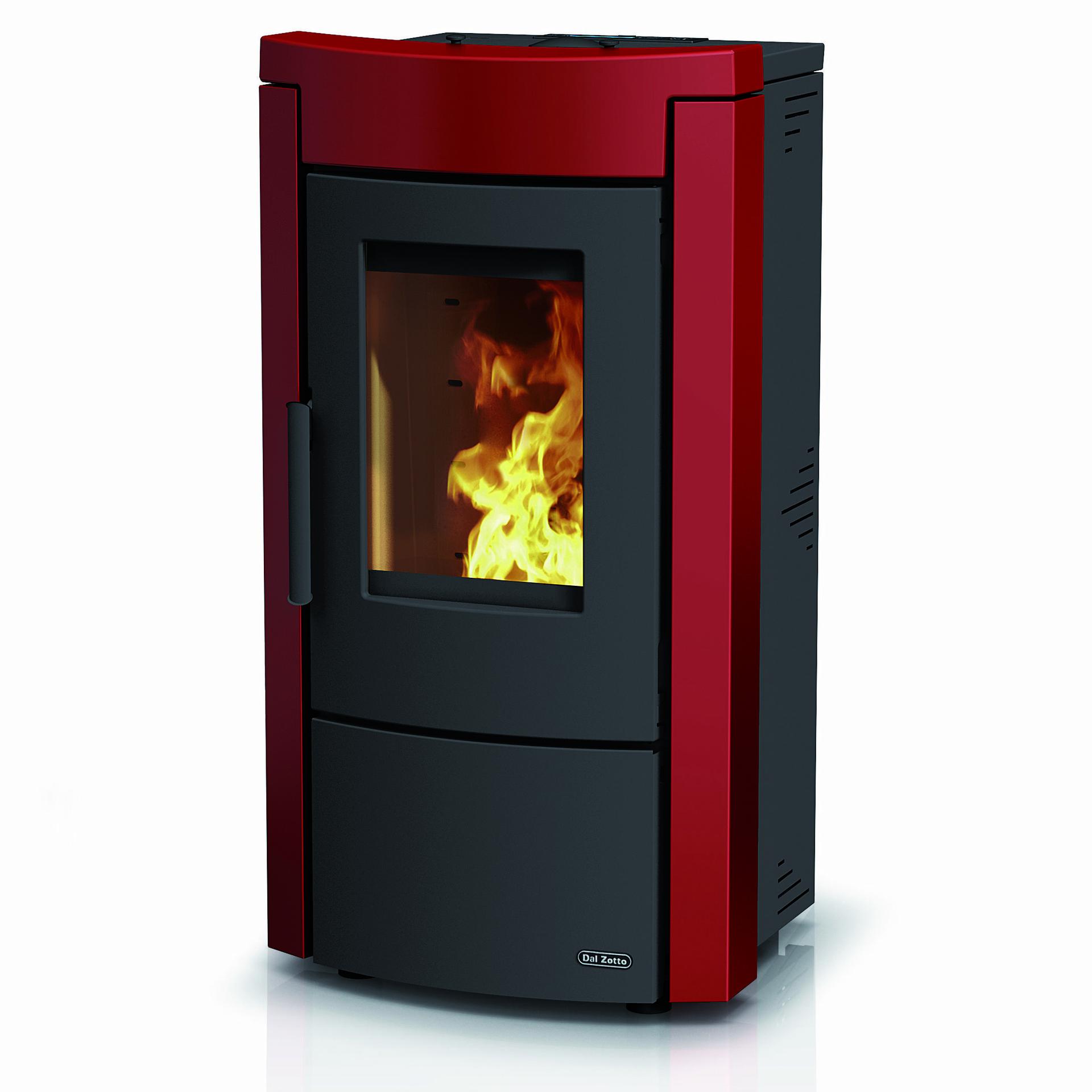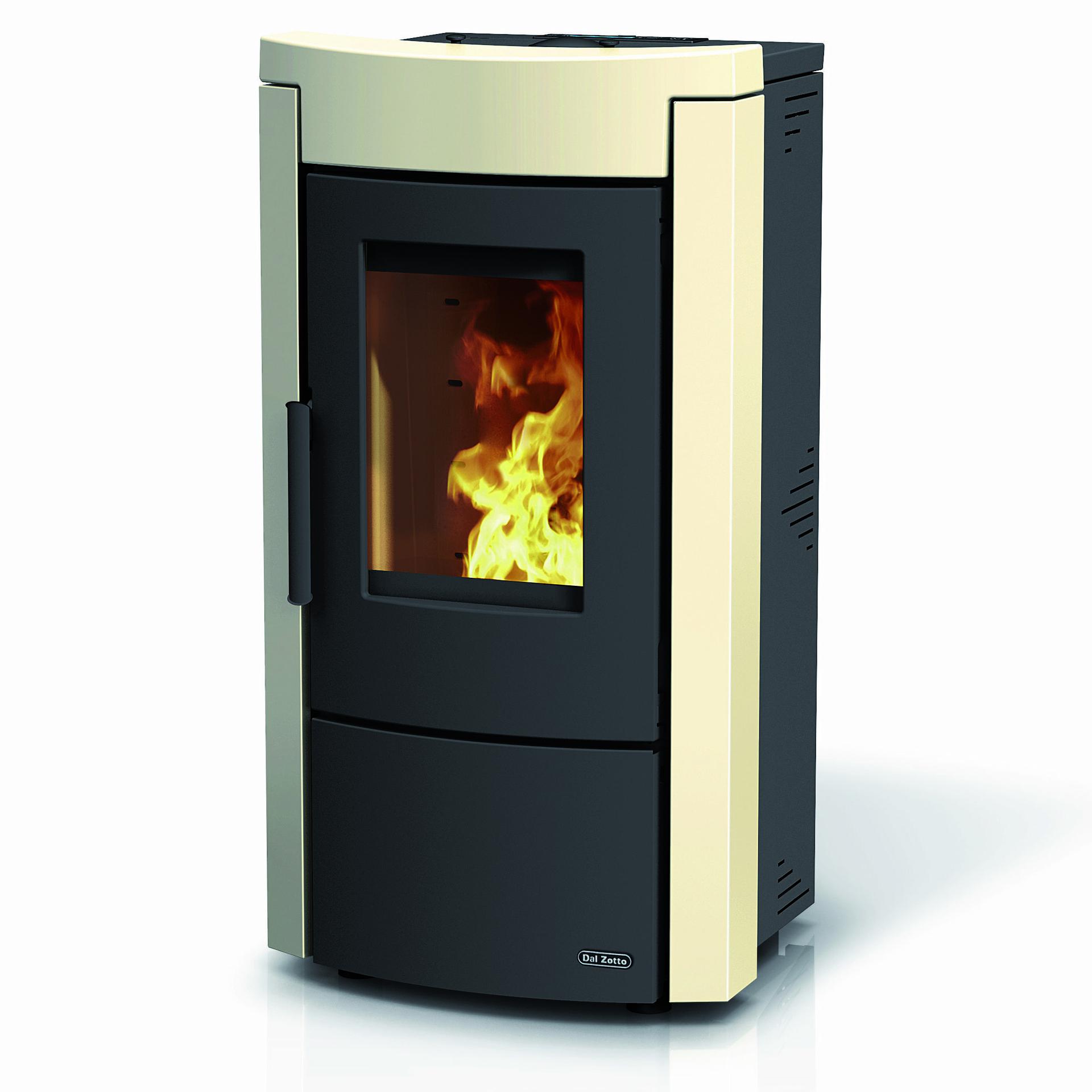 Termo peč na pelete z jekleno konstrukcijo in zgornjim delom iz majolike. Tedenski daljinski upravljalnik in termostat. Obtočna črpalka in ekspanzijska posoda.